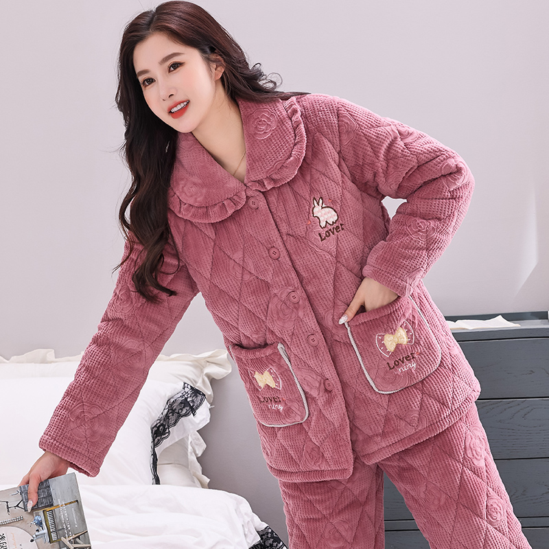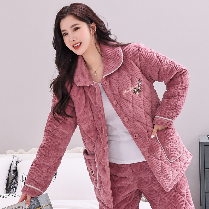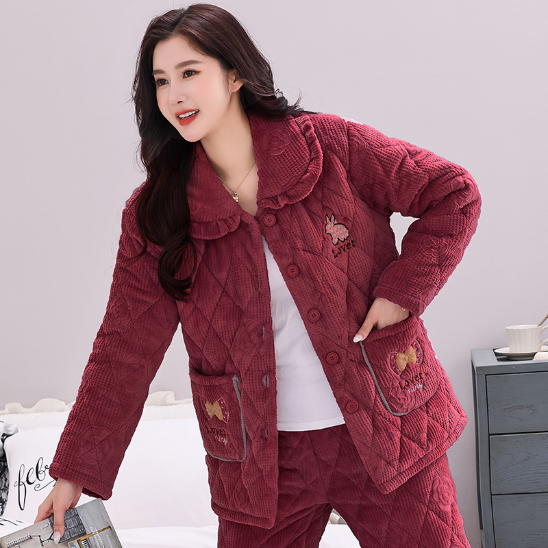 家居服套装 睡衣女士秋冬季 三层加厚加绒珊瑚绒夹棉袄中老年妈妈装