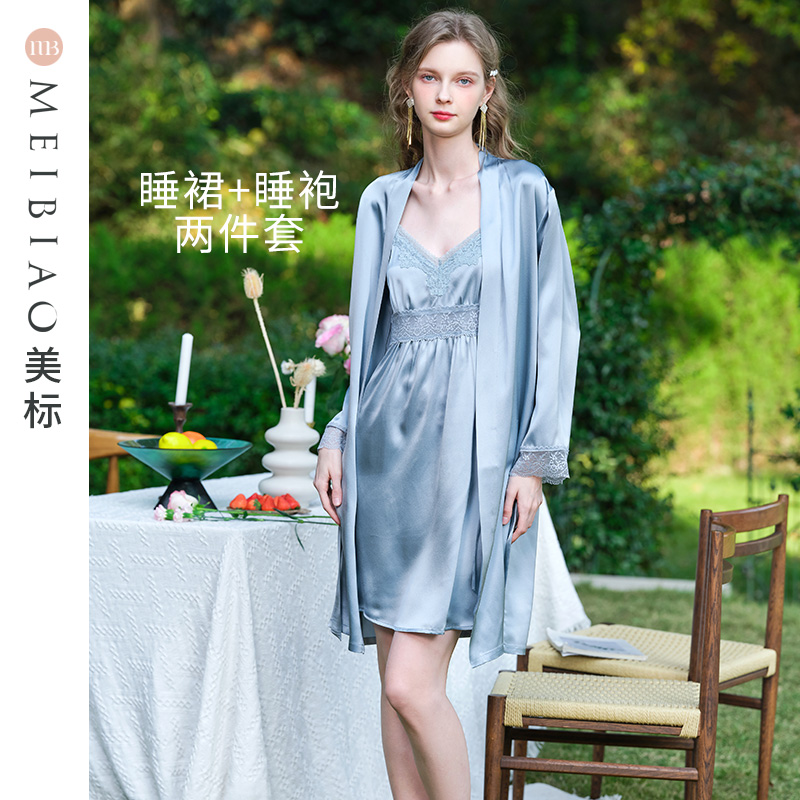 美标春秋新款 6A级重磅真丝睡袍蕾丝100%桑蚕丝睡衣晨袍丝绸家居服