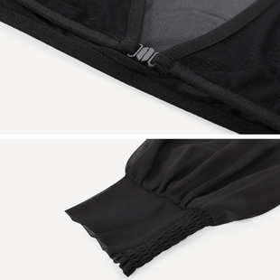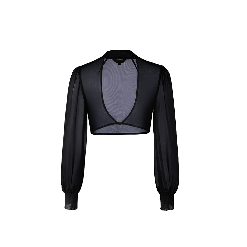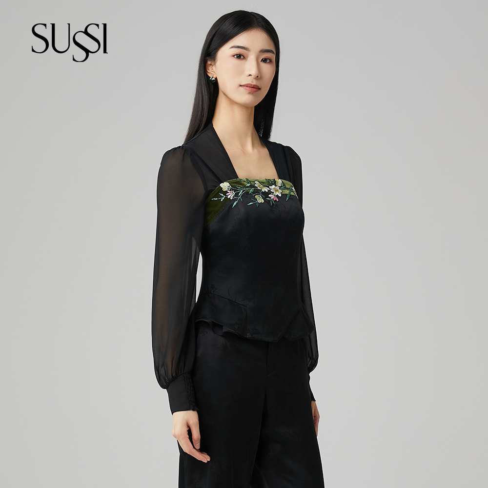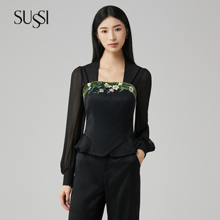 上衣打底假袖 SUSSI 开襟短款 黑色V领灯笼长袖 女 古色24秋商场同款
