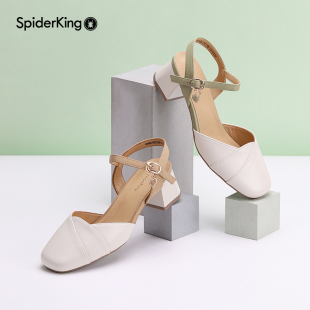 女款 粗跟配裙子中空女鞋 春夏季 羊皮方头时尚 新款 蜘蛛王包头凉鞋