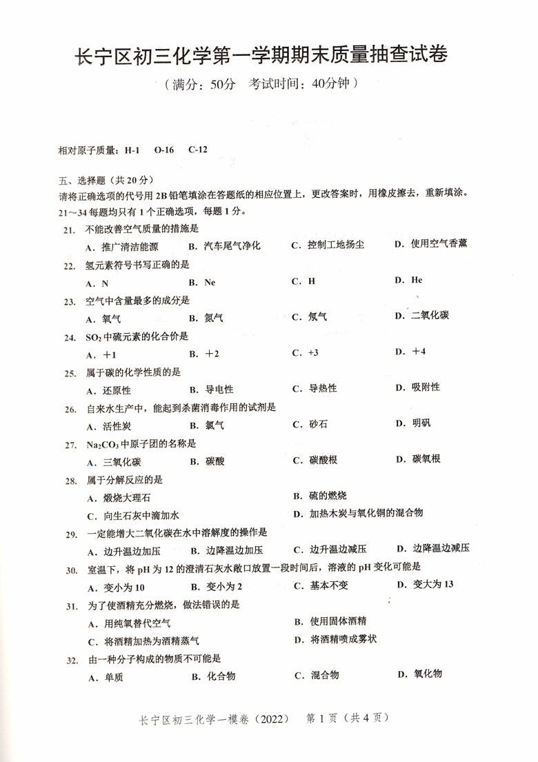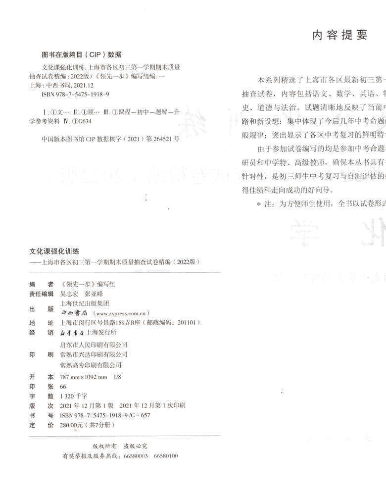 仅试卷 化学 领先一步文化课强化训练2021上海市初三化学一模卷期末质量抽查试卷精编 上海中考一模卷 现货2022年版