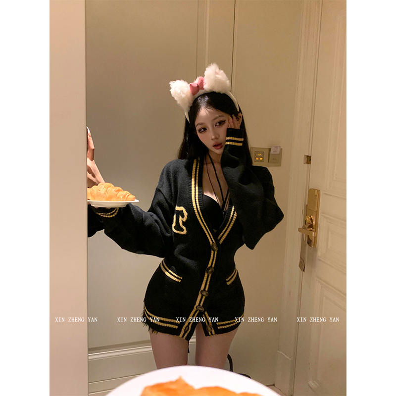 慵懒风上衣 微胖mm辣妹印花撞色V领针织毛衣女25年春季 XZY 欣争艳
