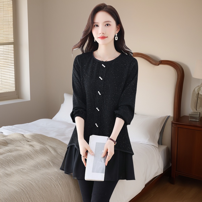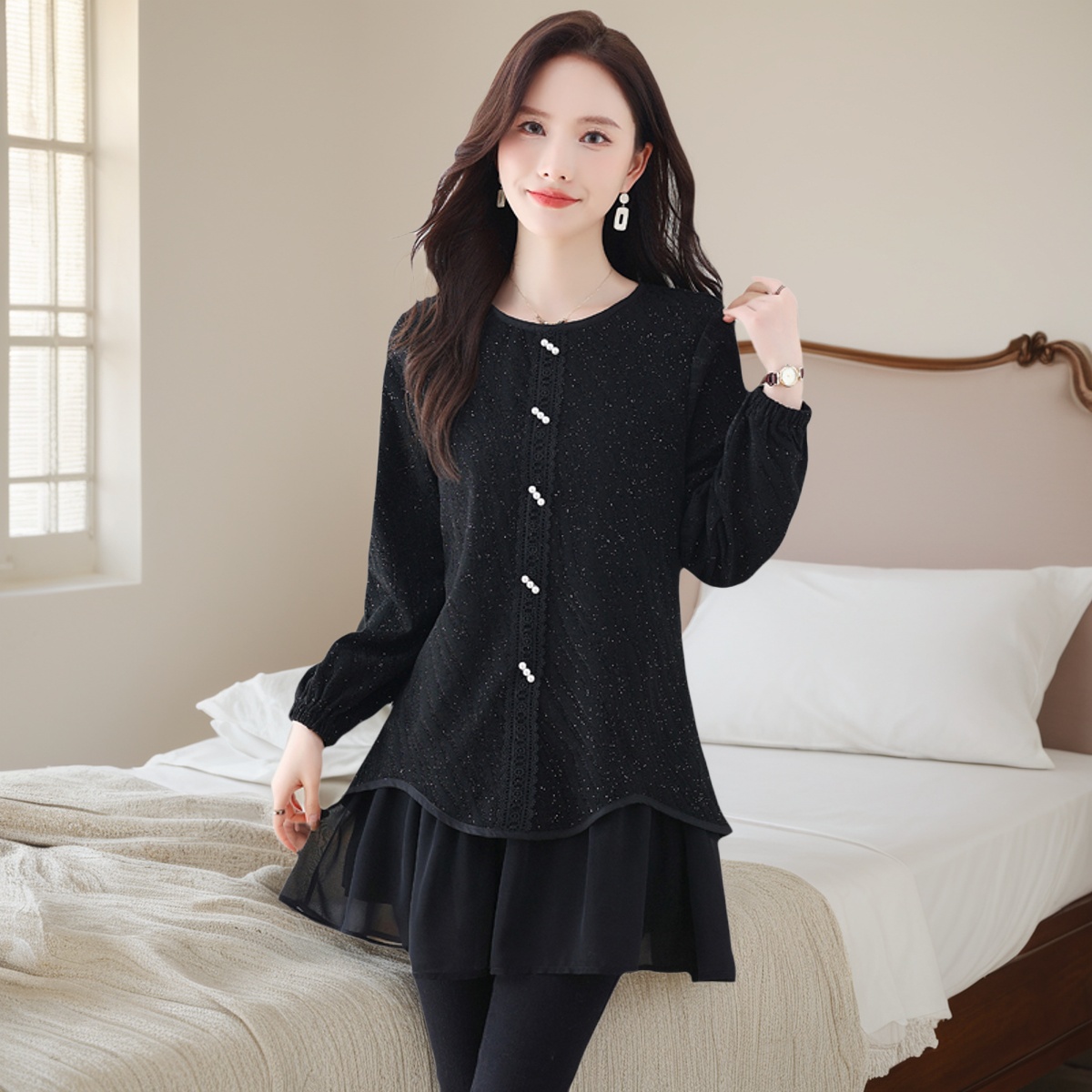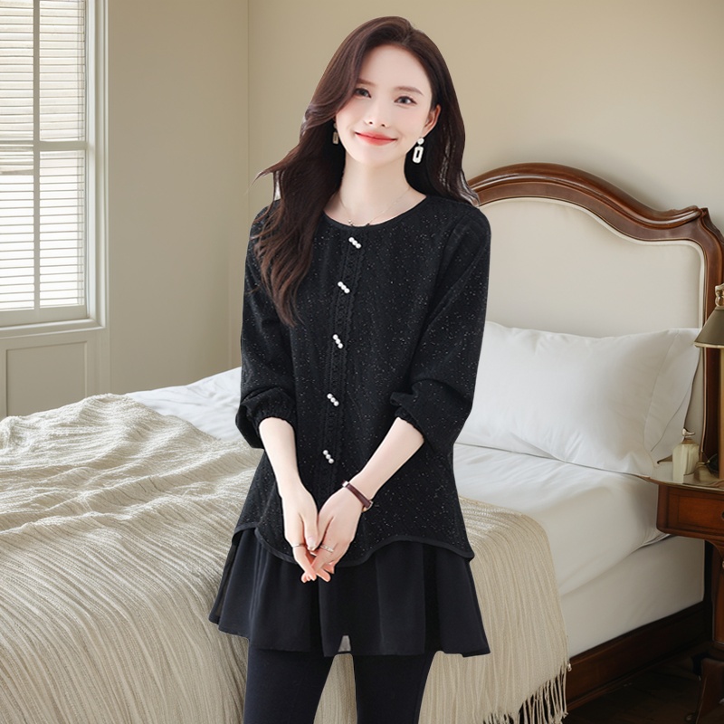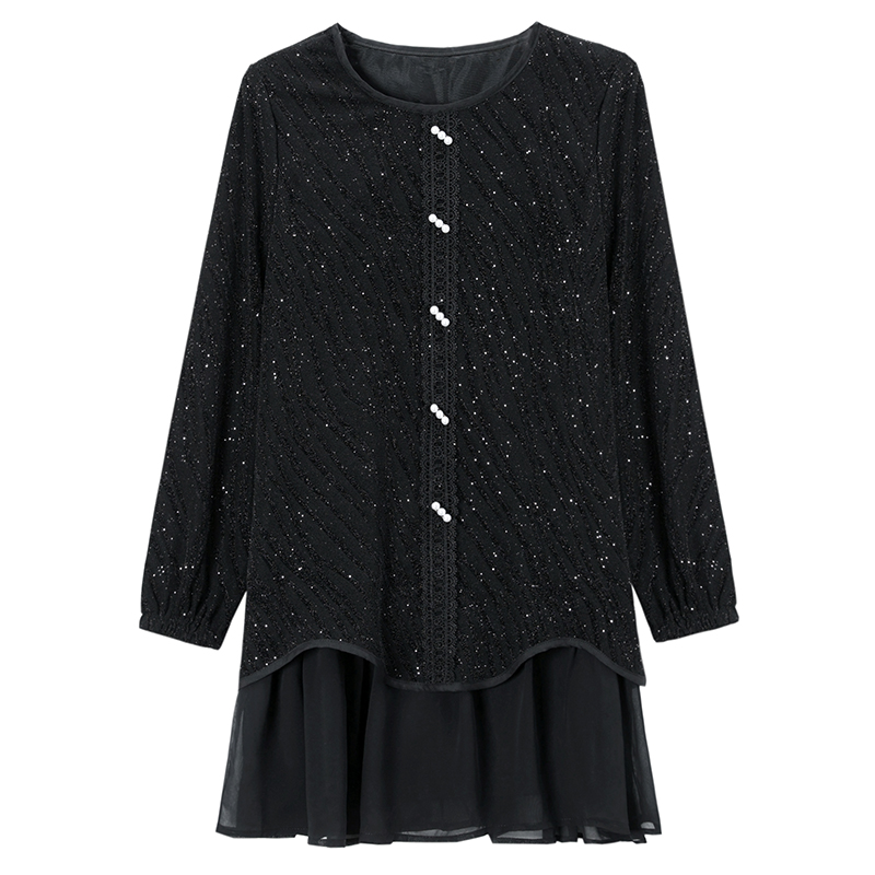 女装 薄款 2025年新款 中年妈妈中长款 遮肚子亮片黑色女上衣 春装 大码