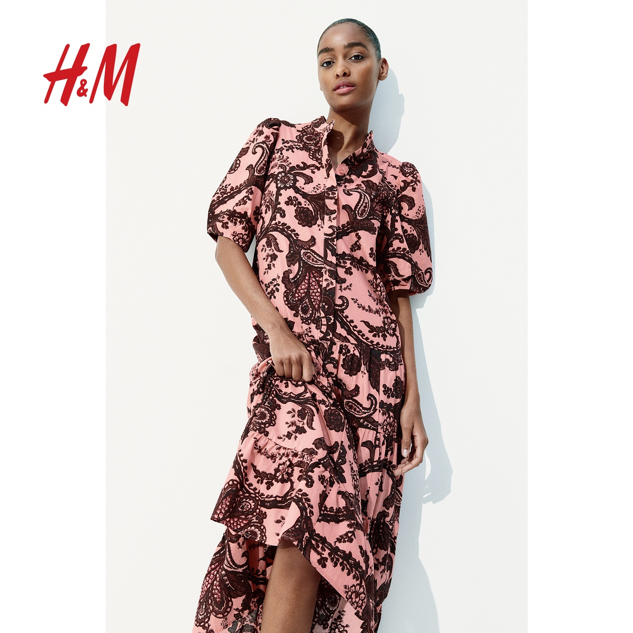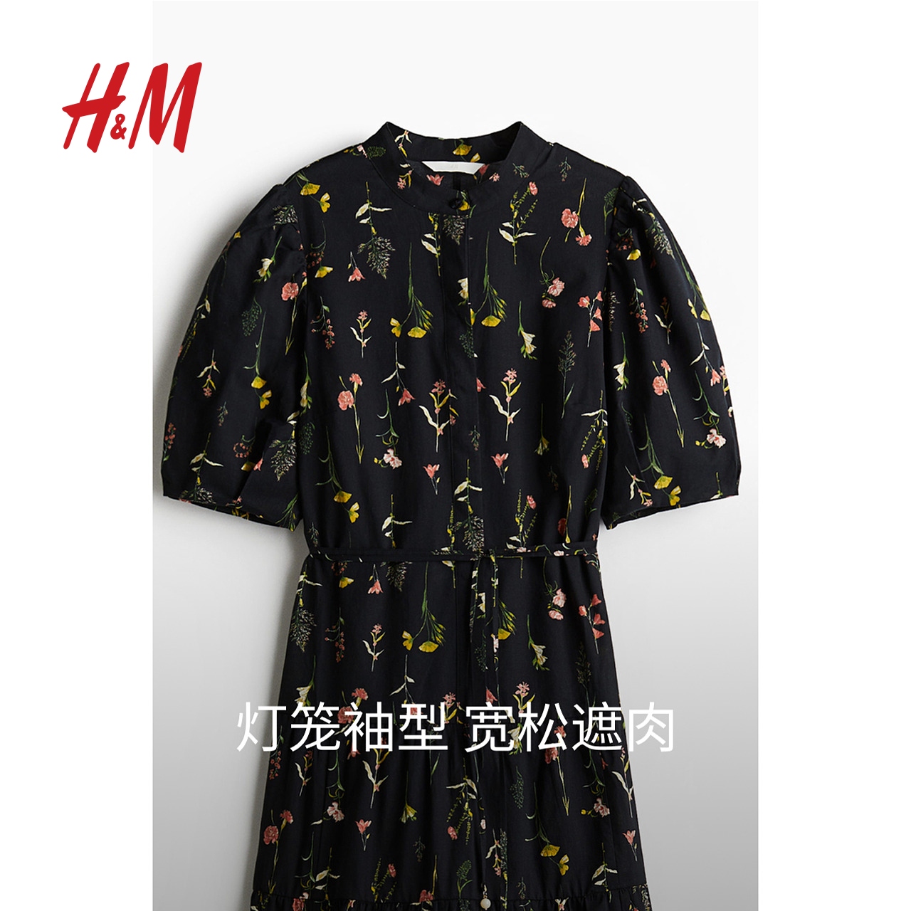 立领灯笼短袖 中式 系带收腰喇叭裙1275645 连衣裙2025秋新款 HM女装