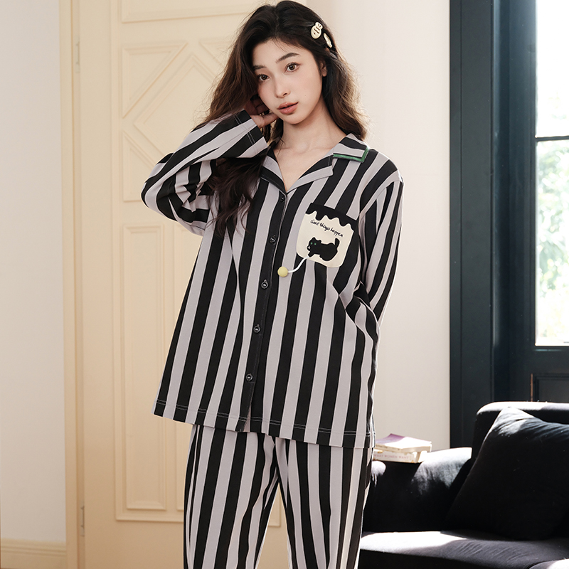 家居服套装 芬腾女睡衣纯棉春秋季 宽松休闲可外穿开衫 长裤 条纹长袖