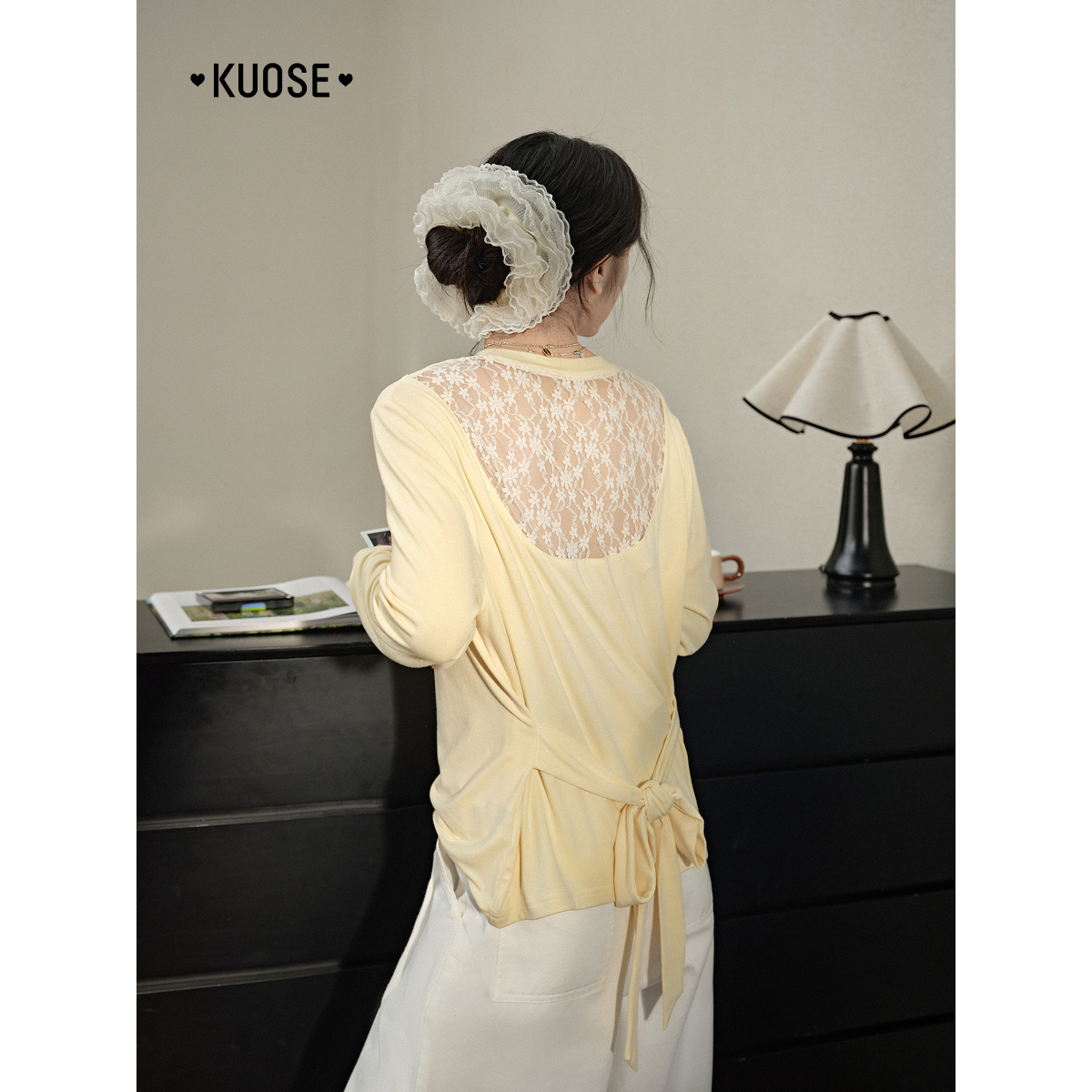 慵懒松弛感上衣新款 2025秋季 女 绑带收腰t恤蕾丝小衫 阔色黄色长袖