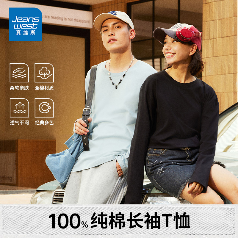 新品 T恤2025秋季 圆领纯棉男女生上衣 简约印花长袖 JR真维斯情侣装