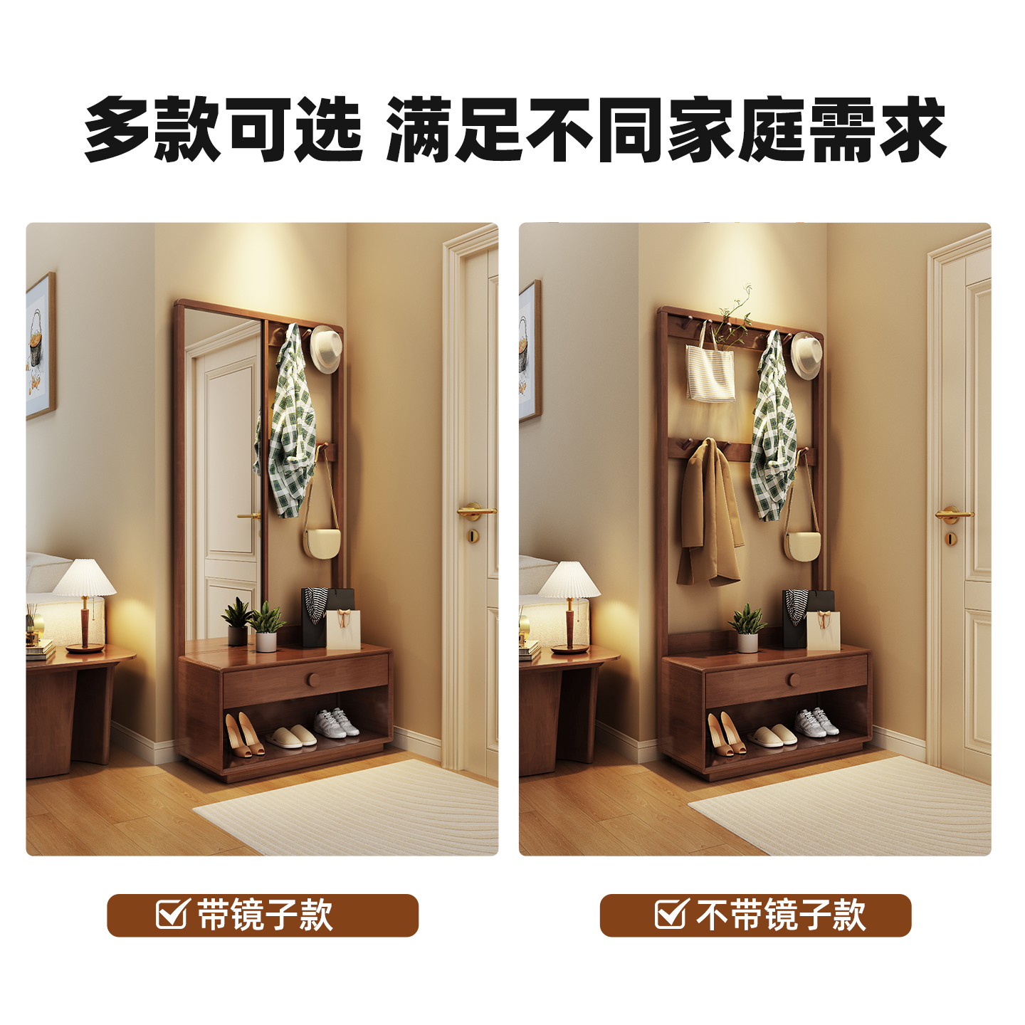 家逸实木换鞋 凳家用落地衣帽架穿衣镜挂衣架一体入户多功能收纳架
