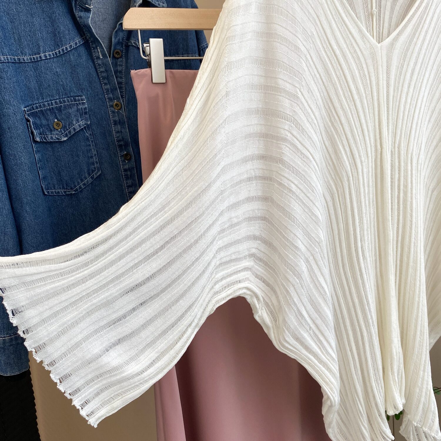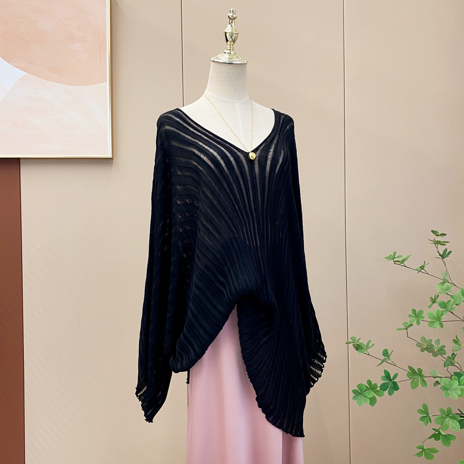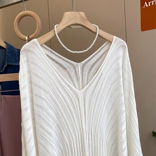 露肩毛衣罩衫 镂空不规则长袖 上衣 时尚 慵懒冰丝针织套头V领女夏季