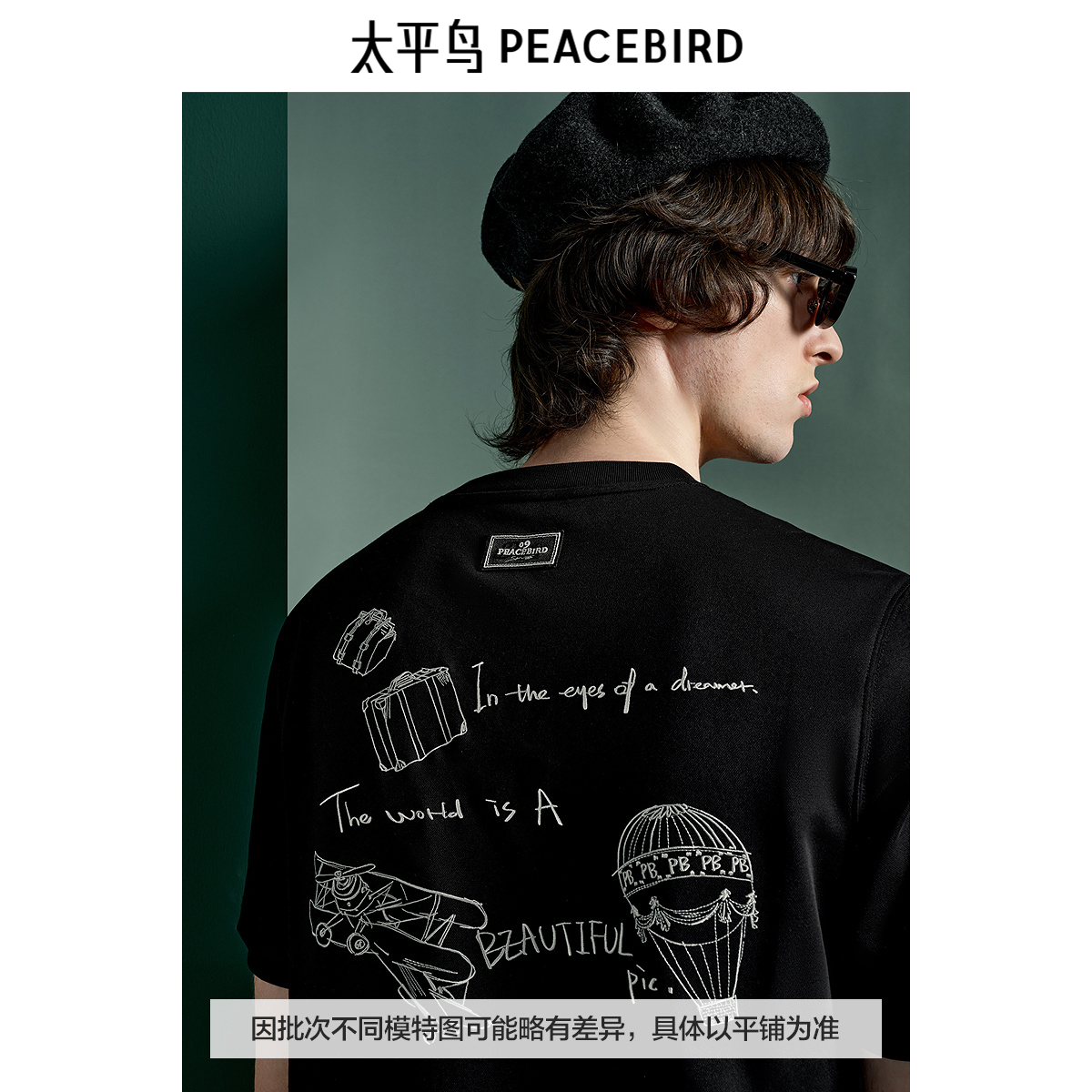 圆领刺绣短袖 黑色体恤衫 T恤秋季 青年半袖 时尚 太平鸟男装