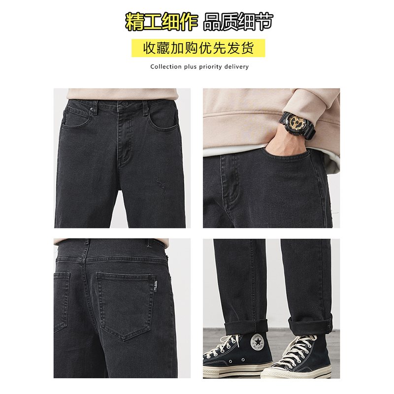 男士 子阔腿休闲长裤 秋冬季 宽松直筒男生裤 新款 回力黑色加绒牛仔裤