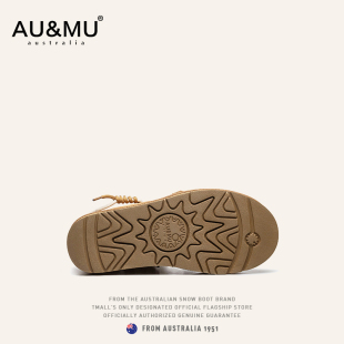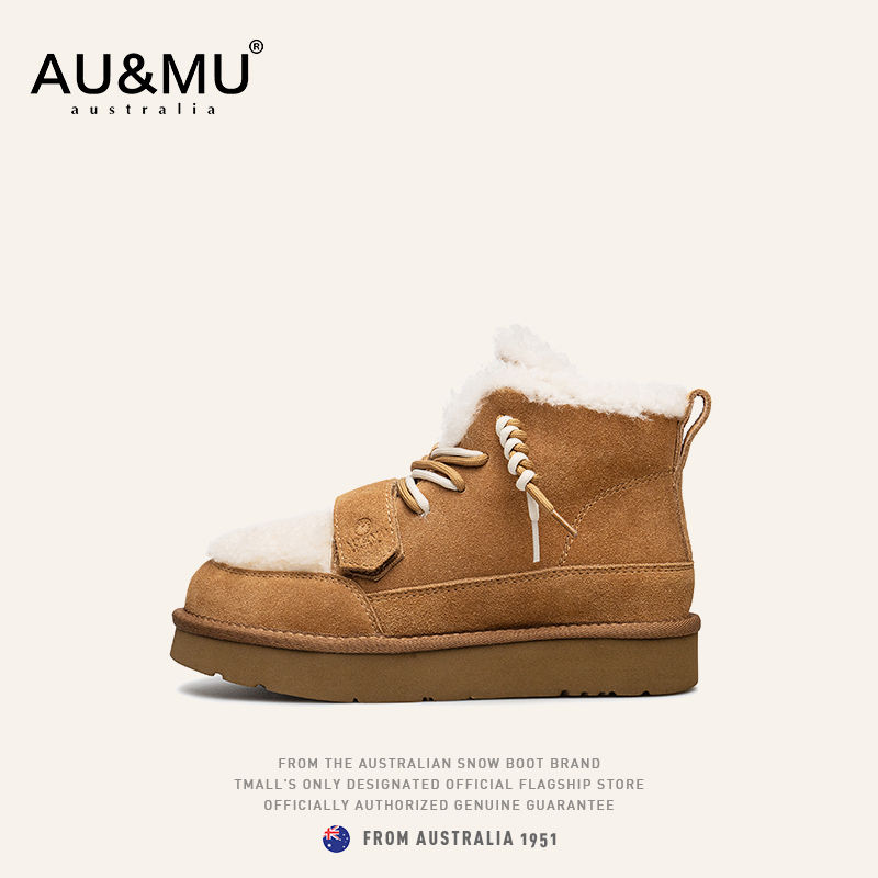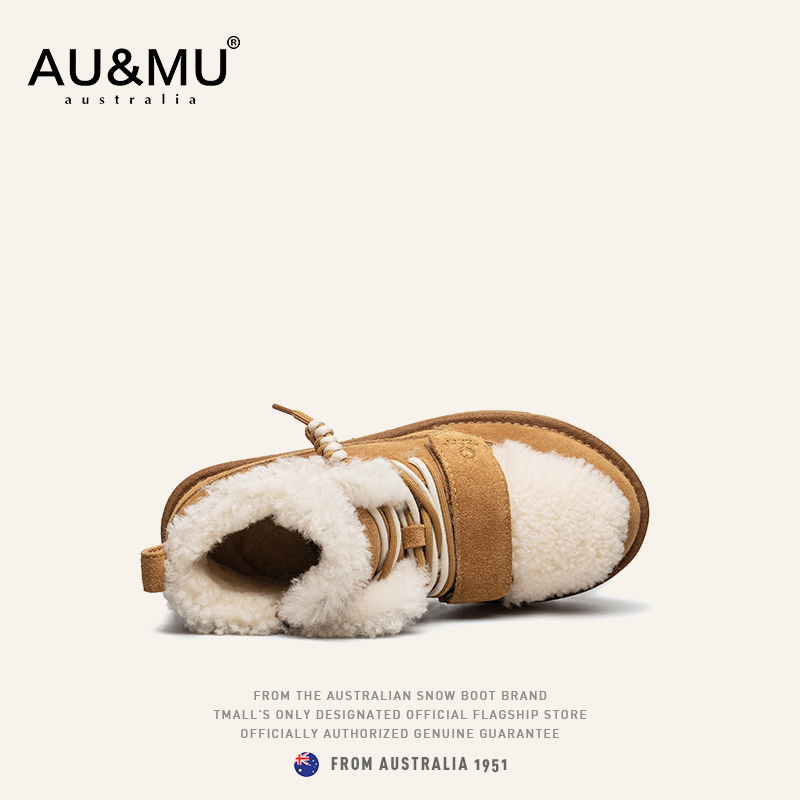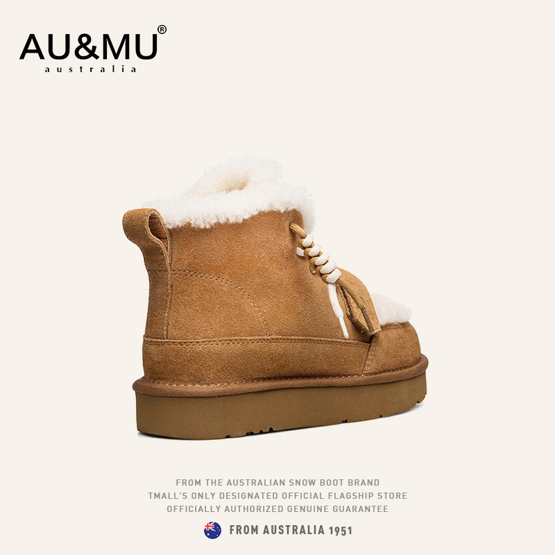 绑带加绒防滑厚底短靴女冬 2025新款 AUMU拼色雪地靴 真羊皮毛一体
