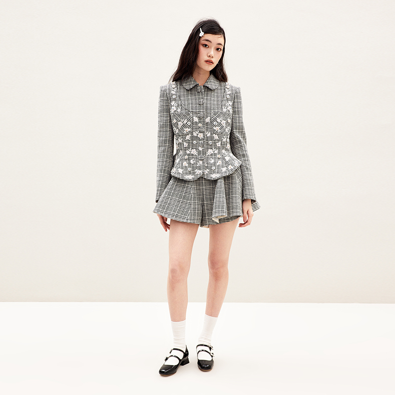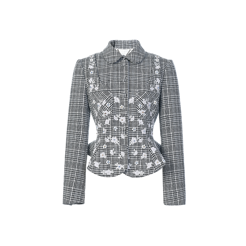 lefame拉飞姆2025年春秋新款 黑白格外套 重工梅花珠片绣中式