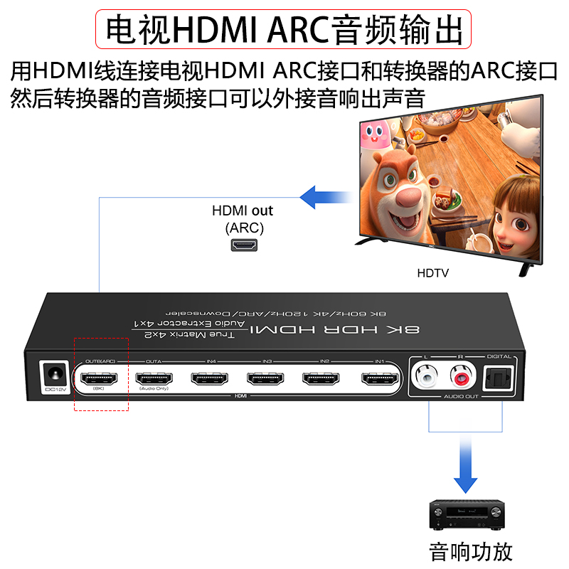 8k60hz高清HDMI切换器四进二出音频分离光纤ARC回传4k120hz电脑ps5 xbox共享2个显示器电视HDR杜比视界全景声