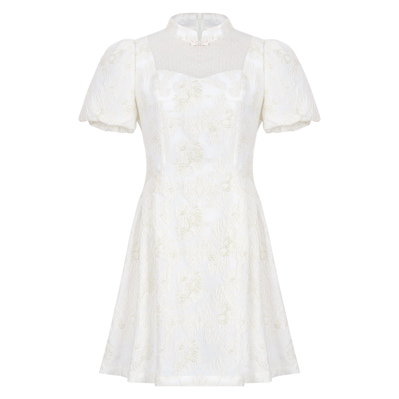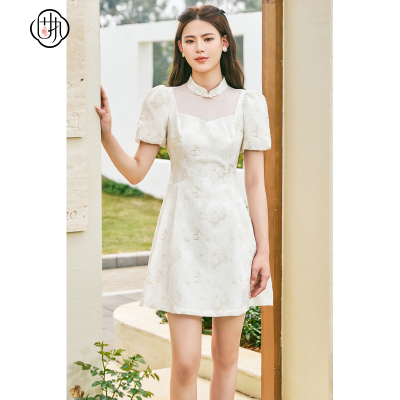 连衣裙80132LQ08121 小个子短袖 固执夏新款 立领拼接蕾丝泡泡袖