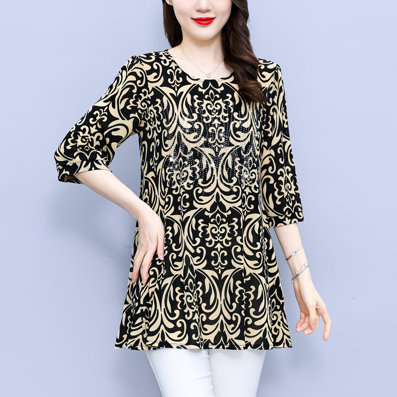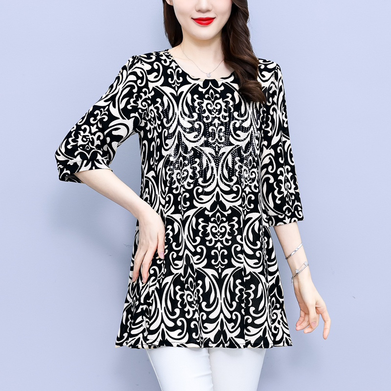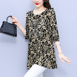 2025中年妈妈宽松遮肉中长款 夏季 女上衣 冰丝印花减龄气质小衫 大码
