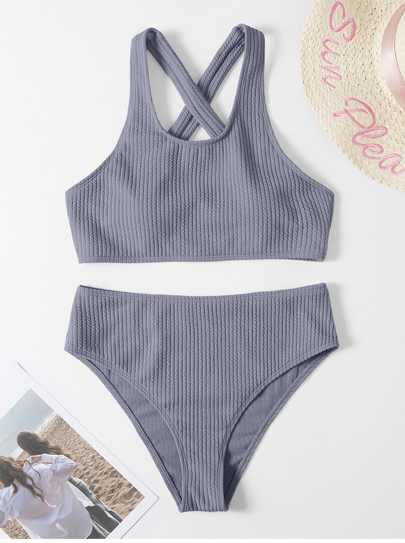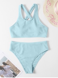 欧美性感小坑条U领露背高腰分体比基尼 温泉泳衣女沙滩海边度假穿