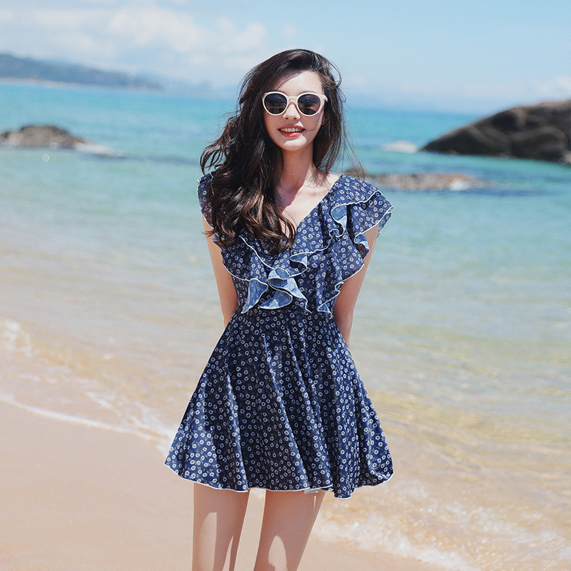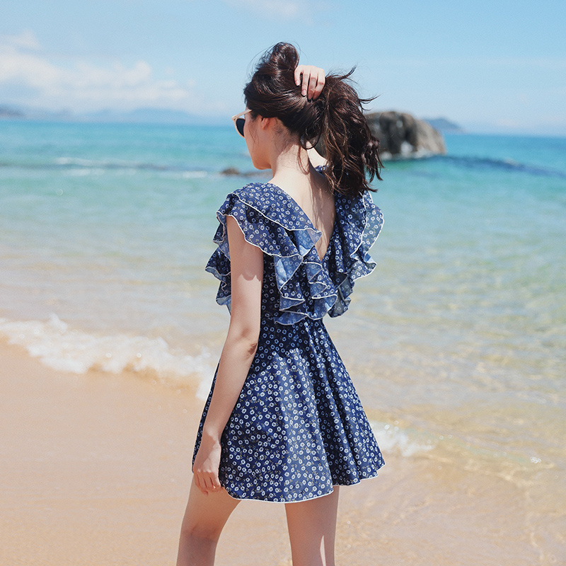 荷叶边泳衣女款 女士遮肚显瘦游泳衣 夏保守微胖女孩遮肉连衣裙大码