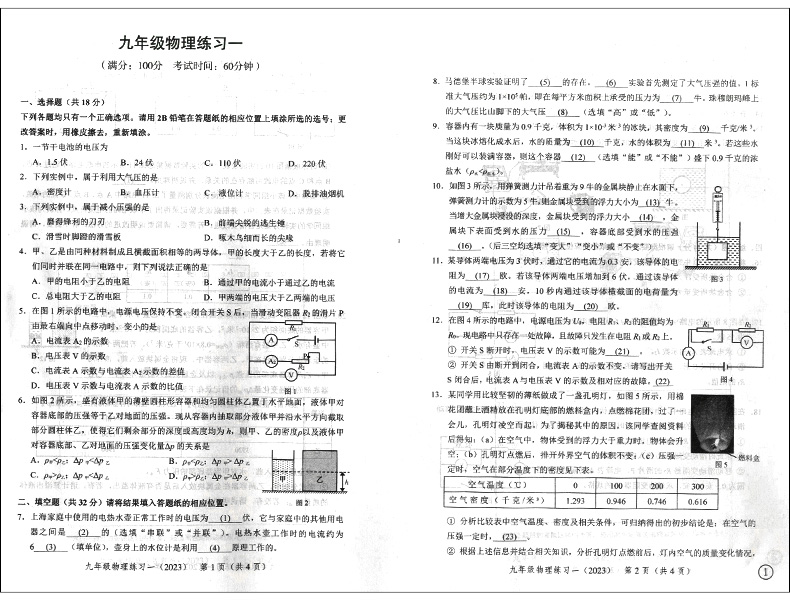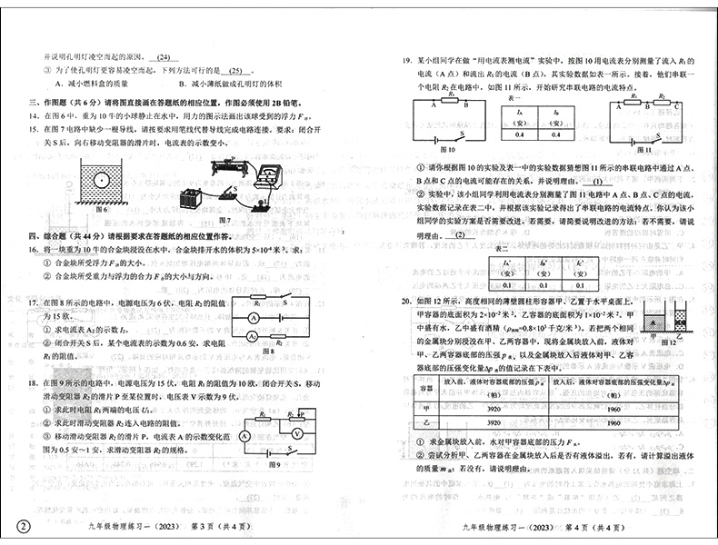 中西书局领先一步试卷 2023物理一模卷 仅试卷 文化课强化训练物理 上海市初三第一学期期末质量抽查试卷 上海中考一模卷物理