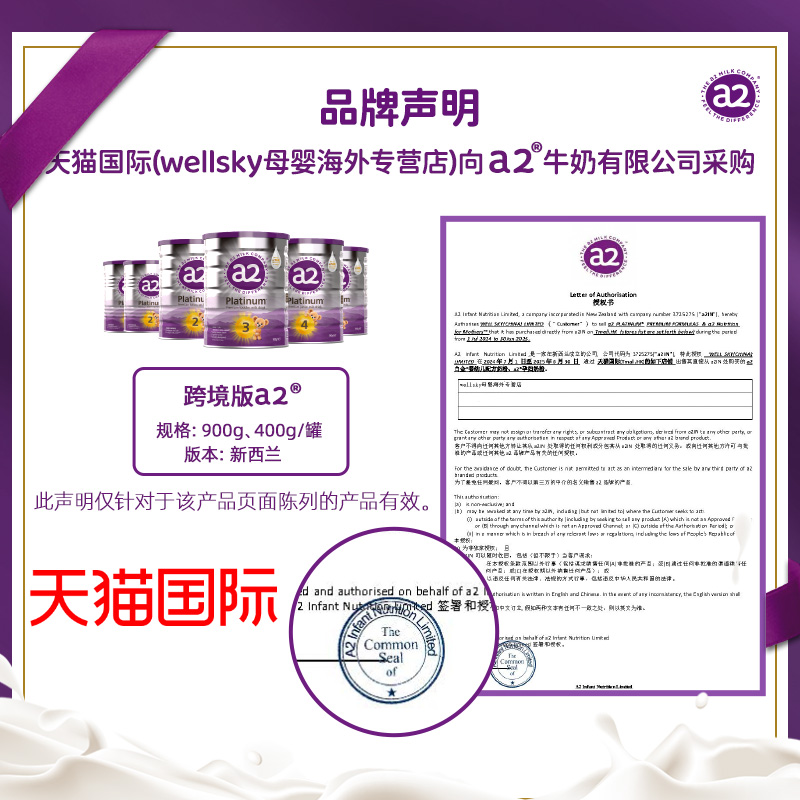 二段奶粉新西兰原装 12月 进口a2一 a2紫白金婴幼儿2段奶粉400g