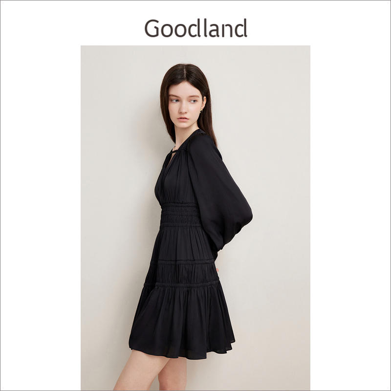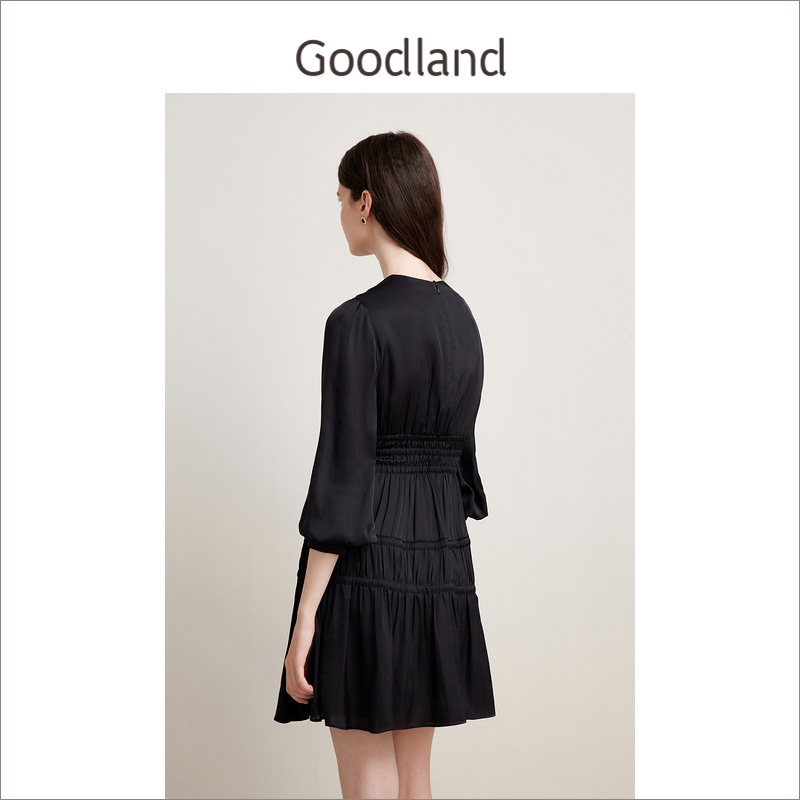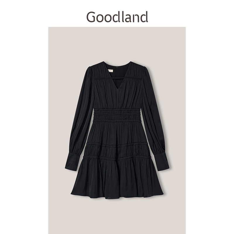 短裙 v领连衣裙 Goodland美地24春款 黑色微褶设计a字裙法式