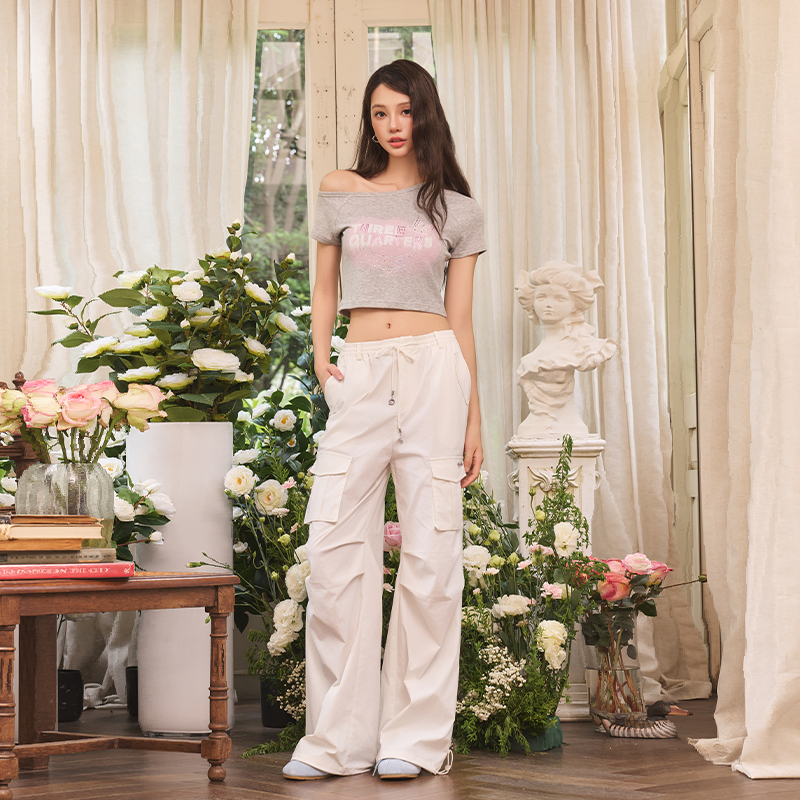 女士灰色莫代尔斜肩印花T恤银泰 春夏新款 301355 Quarters Three