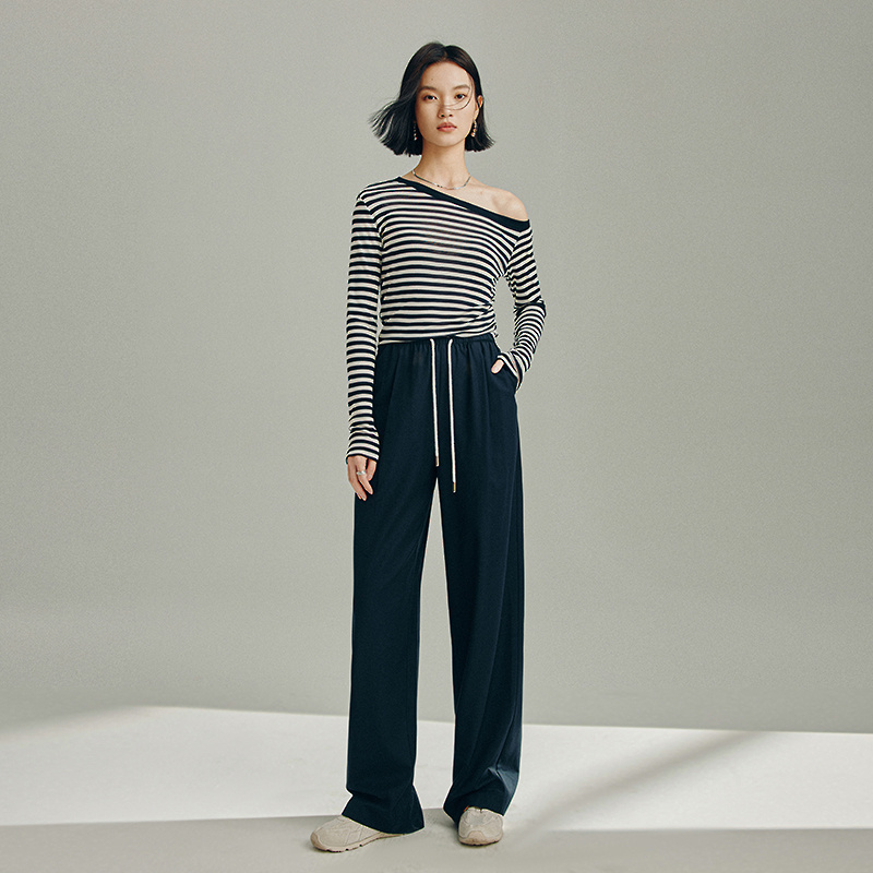显瘦上衣 百搭修身 藏青条纹斜肩式 小心机T恤女MOFAN摩凡2025秋新款