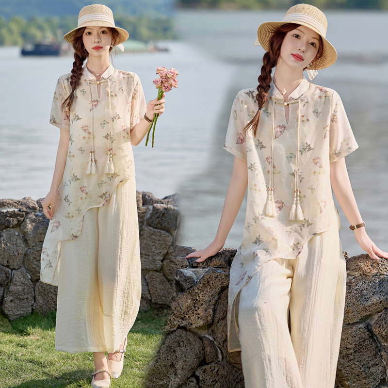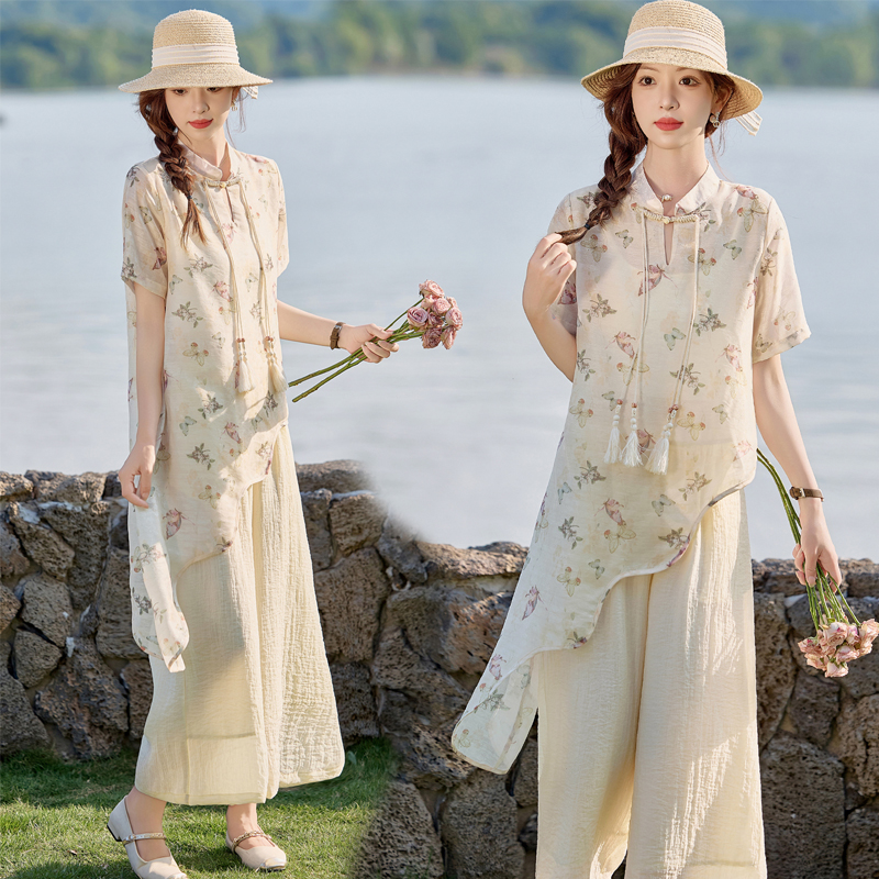 高端印花旗袍上衣阔腿裤 新中式 新款 女2025年夏季 两件套 国风套装