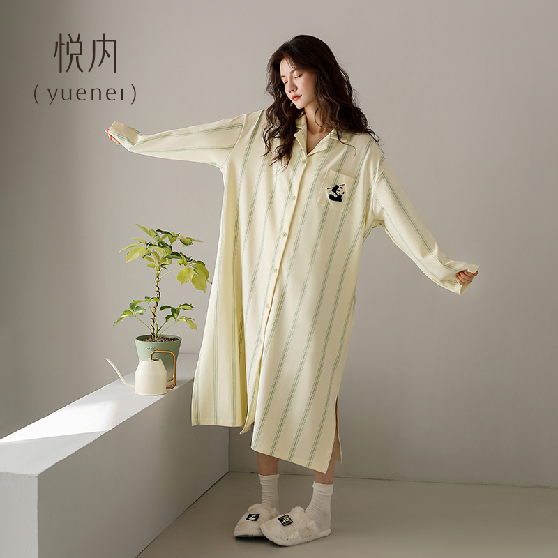 纯棉长款 长袖 大码 开衫 熊猫国潮风 悦内睡裙女士睡衣春秋款 衬衫 秋季