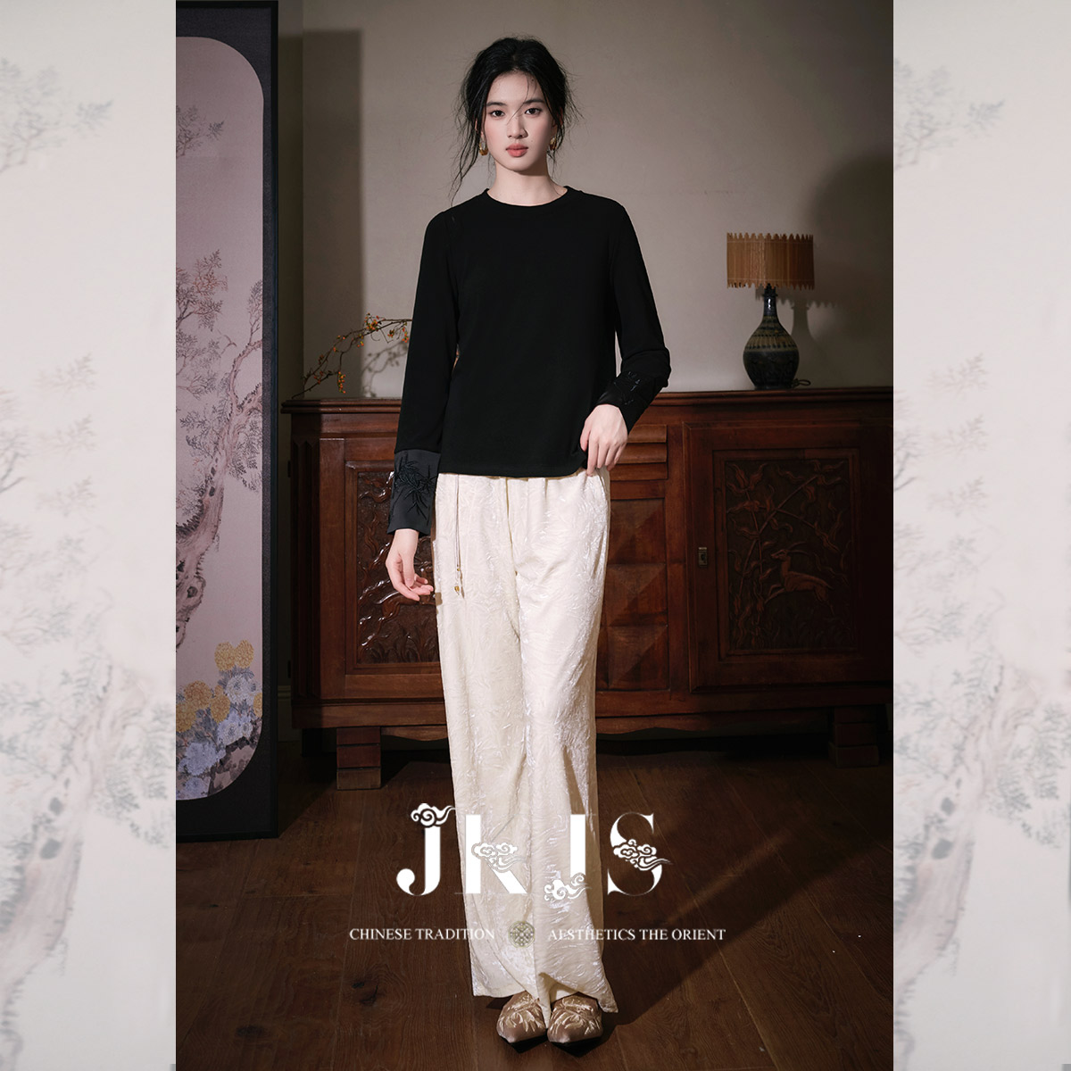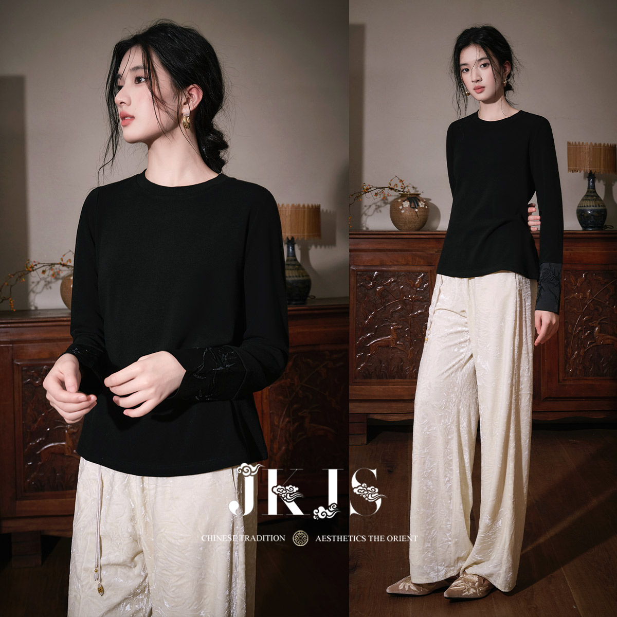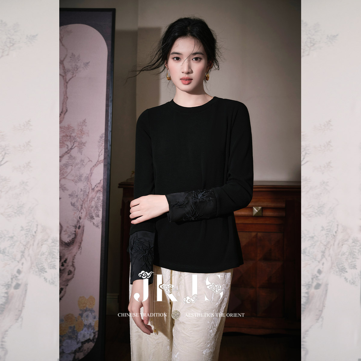观竹 2025新款 人丝木代尔 T恤国风打底衫 内搭绣花上衣 长袖 JKJS