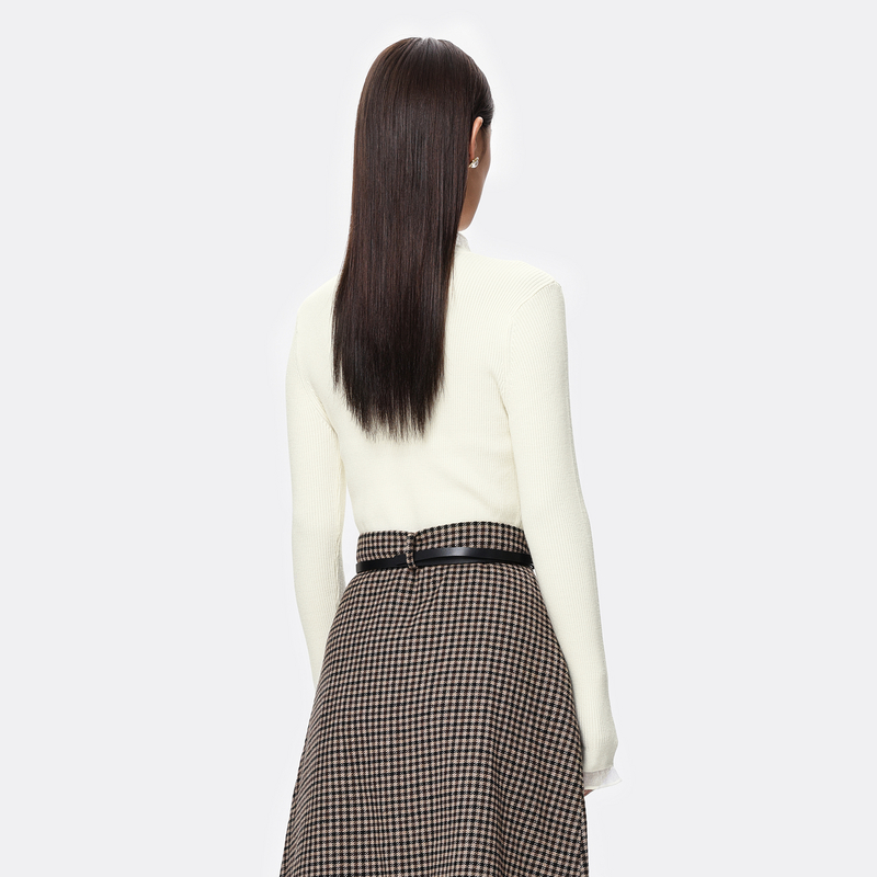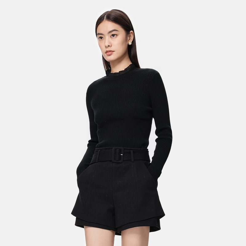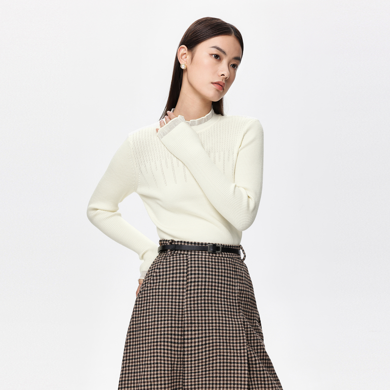 女冬季 飘蕾木耳边拼接毛针织衫 圆领镂空显瘦毛衫 清仓直降