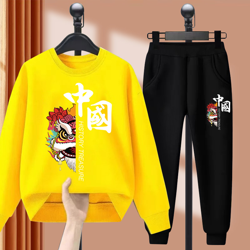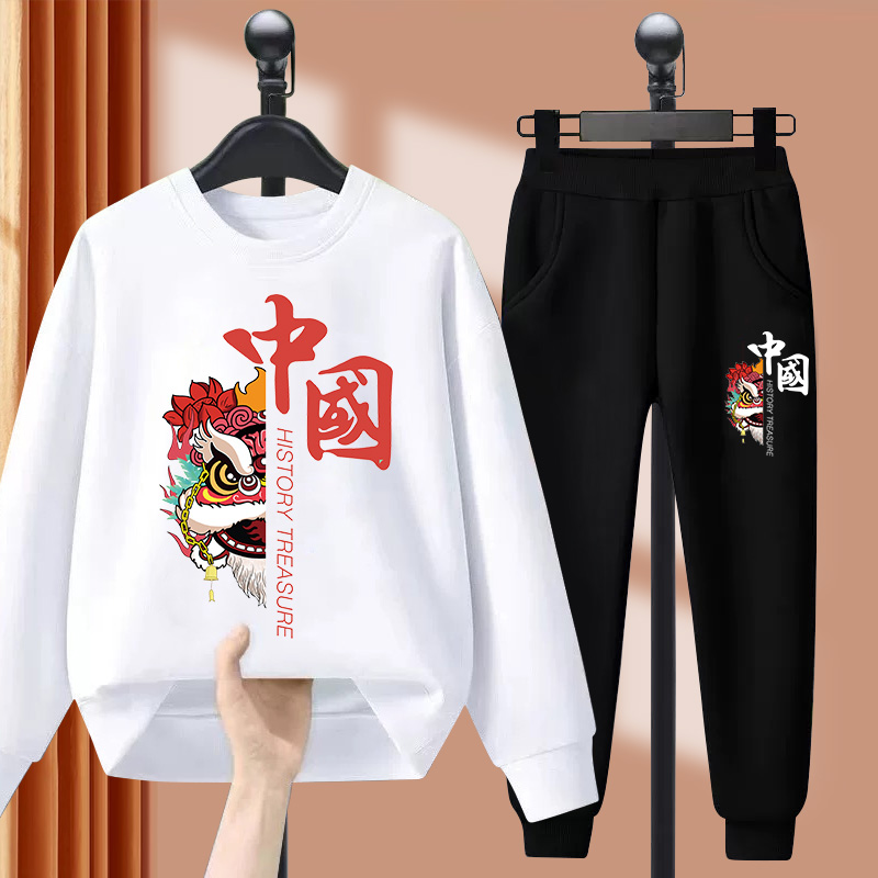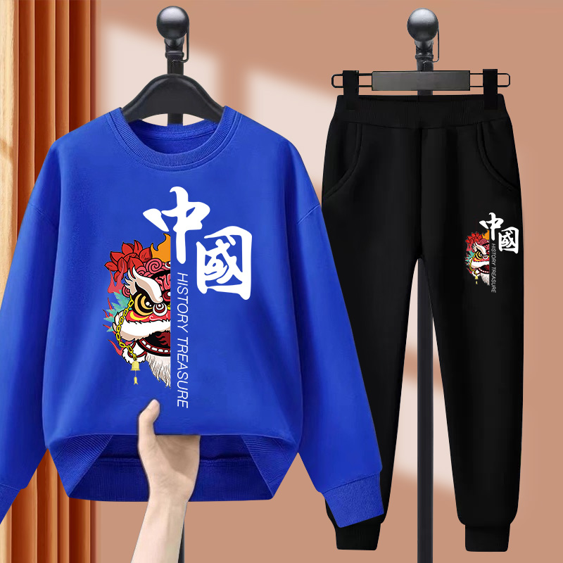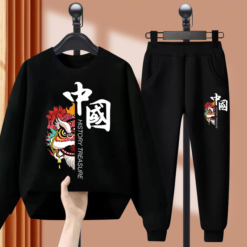 中大童男孩两件套 国潮红色醒狮卫衣秋装 男童春秋套装 纯棉2025新款