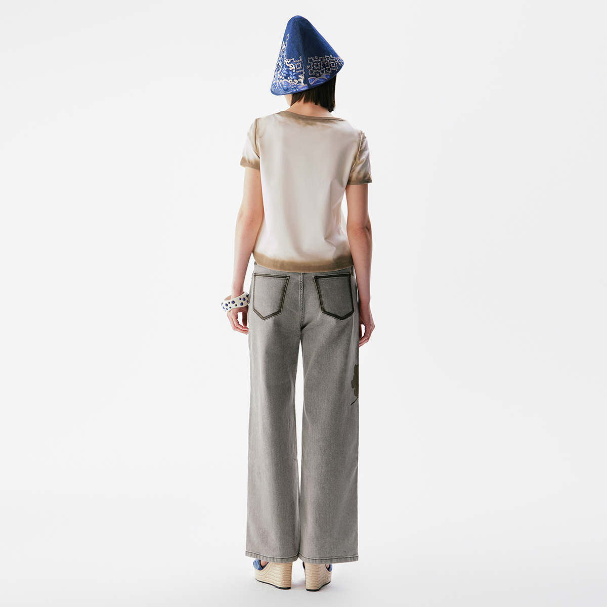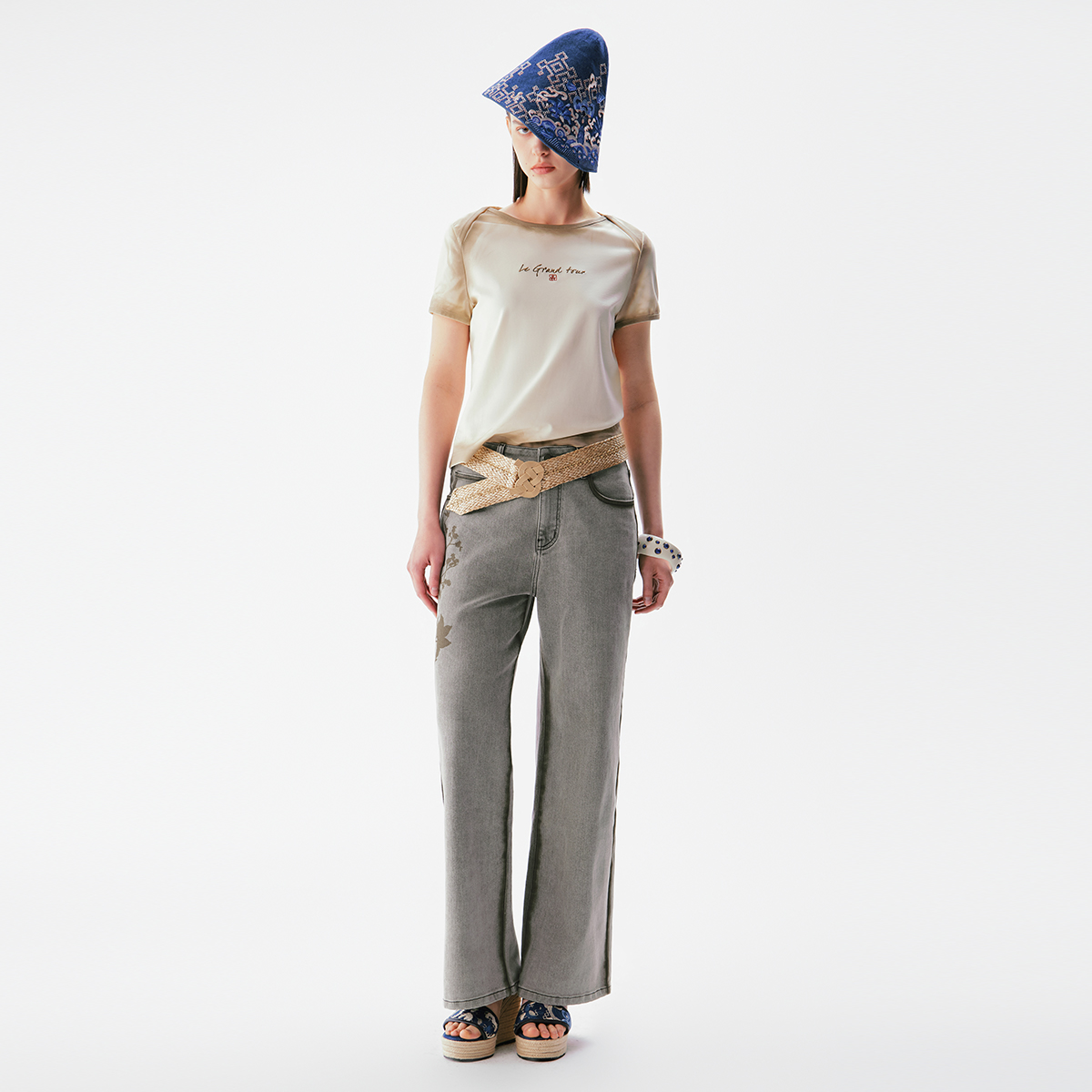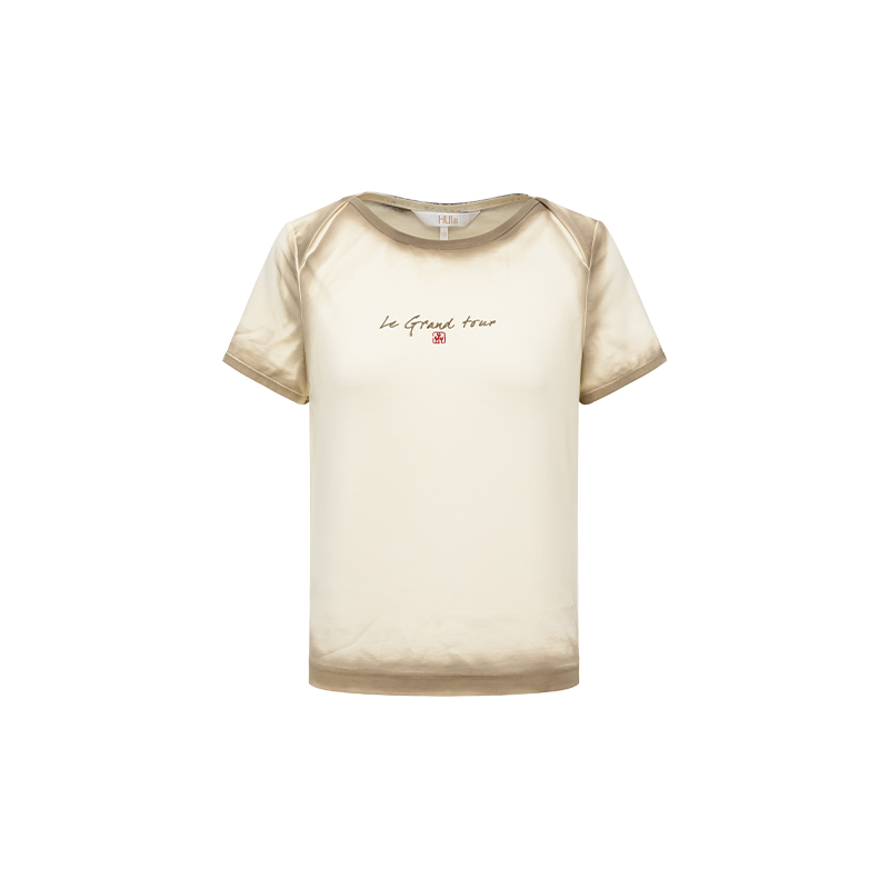 HUI卉莱赛尔棉拼色边缘晕染法文壮游刺绣简约T恤2025新款 上衣 短袖