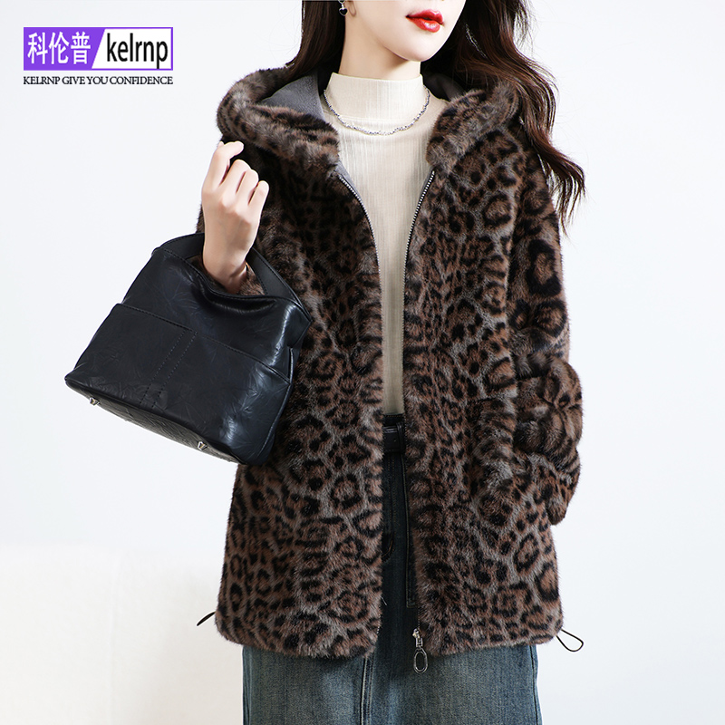 高档金貂绒大衣女2025冬新连帽豹纹正品 牌仿水貂毛毛环保皮草外套