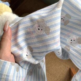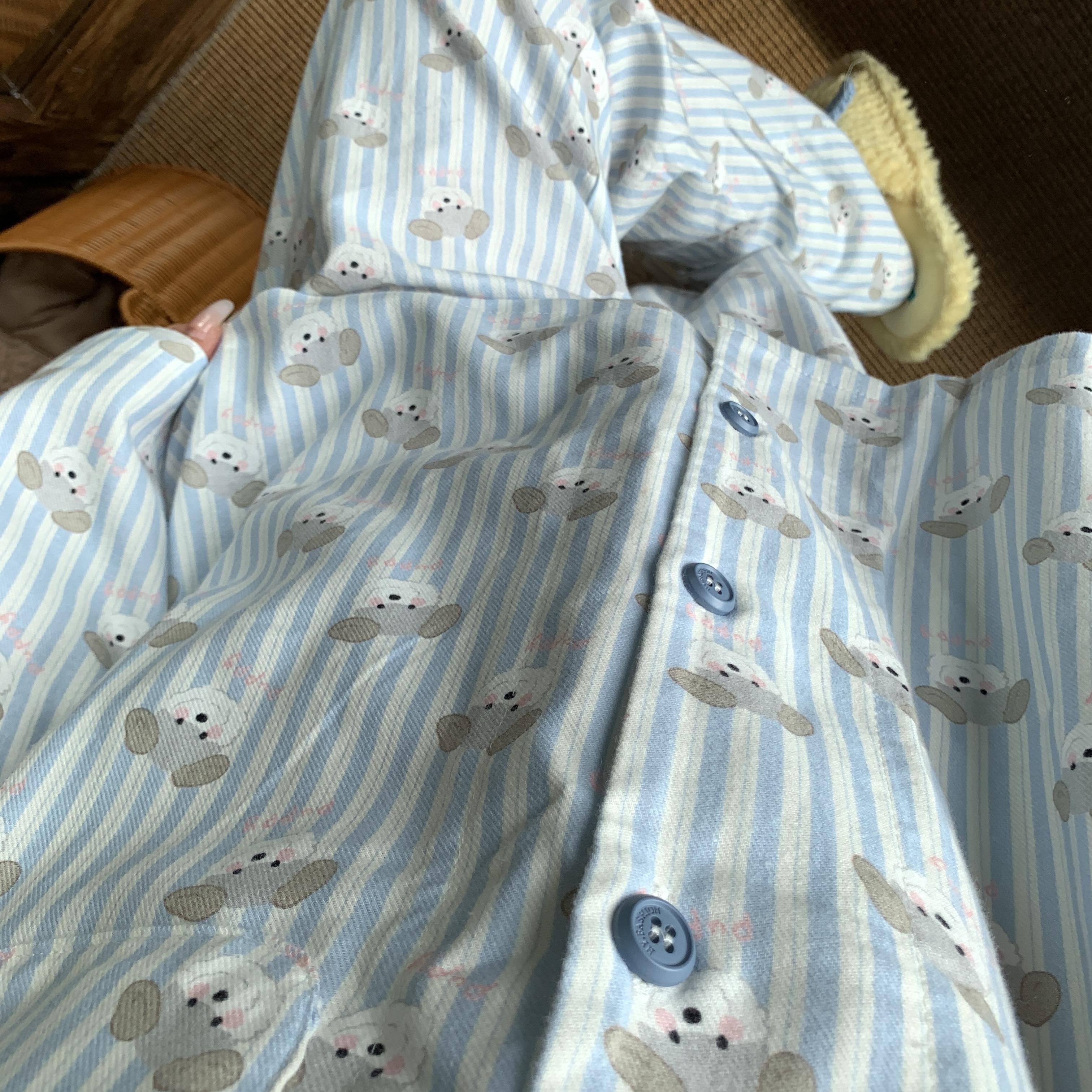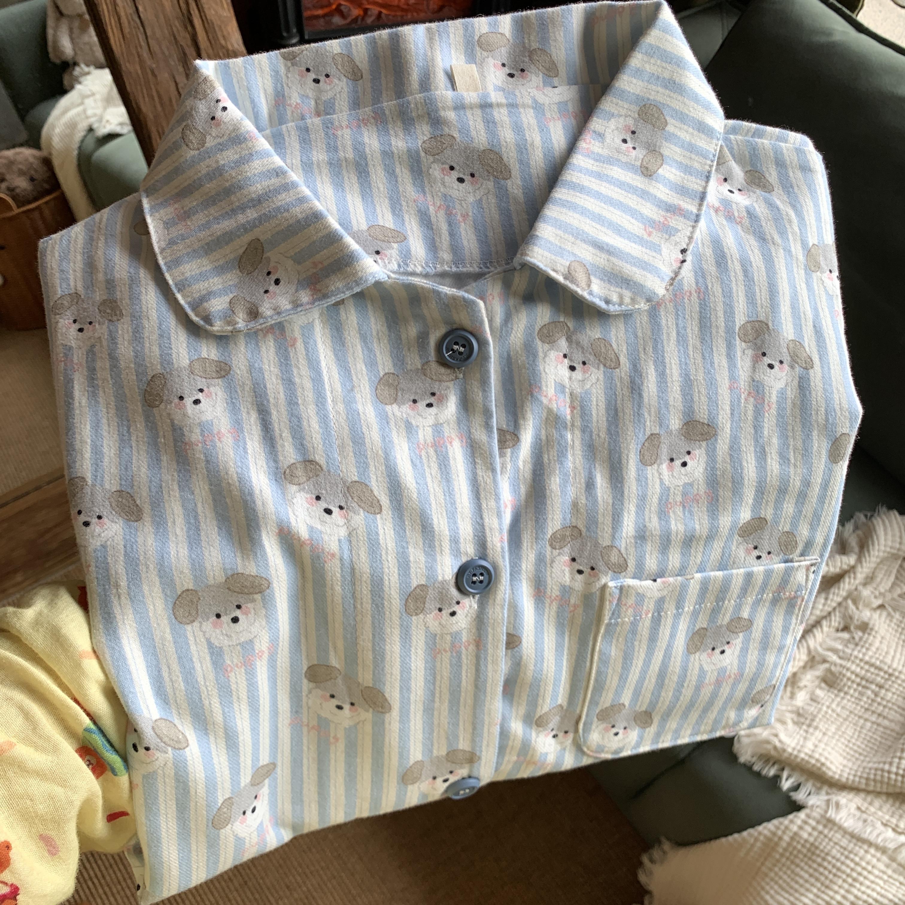 睡衣套装 长裤 ~可爱舒适家居服 条纹小狗全棉磨毛小翻领长袖 上新