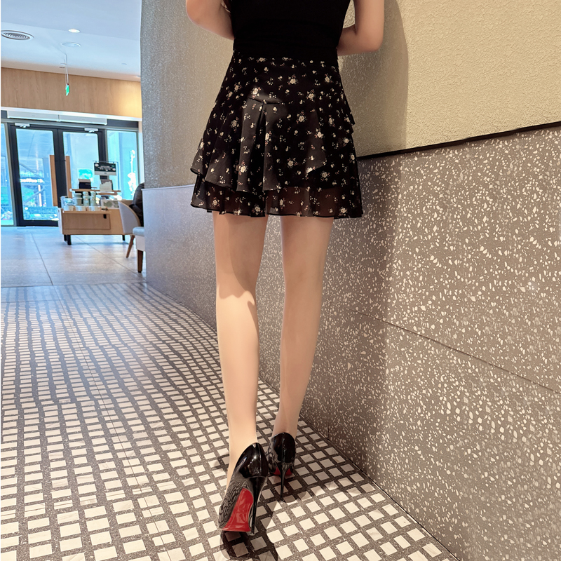 小个子高腰a字裙雪纺短裙百褶裙 新款 黑色碎花裙裤 半身裙女春夏季