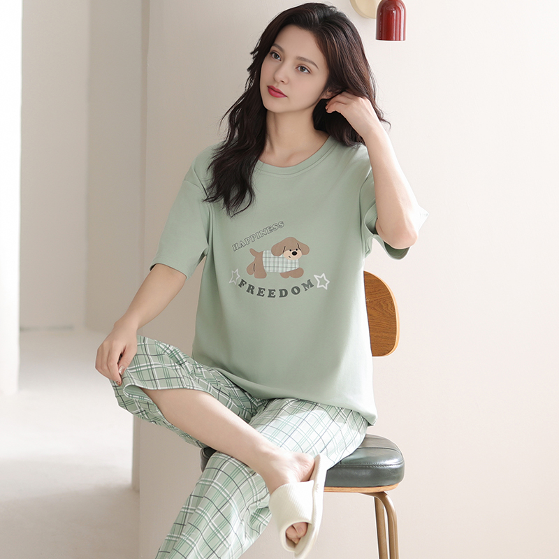 七分裤 纯棉短袖 套装 薄款 家居服 芬腾夏季 可爱少女休闲大码 睡衣女款