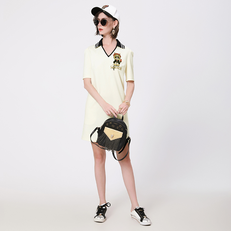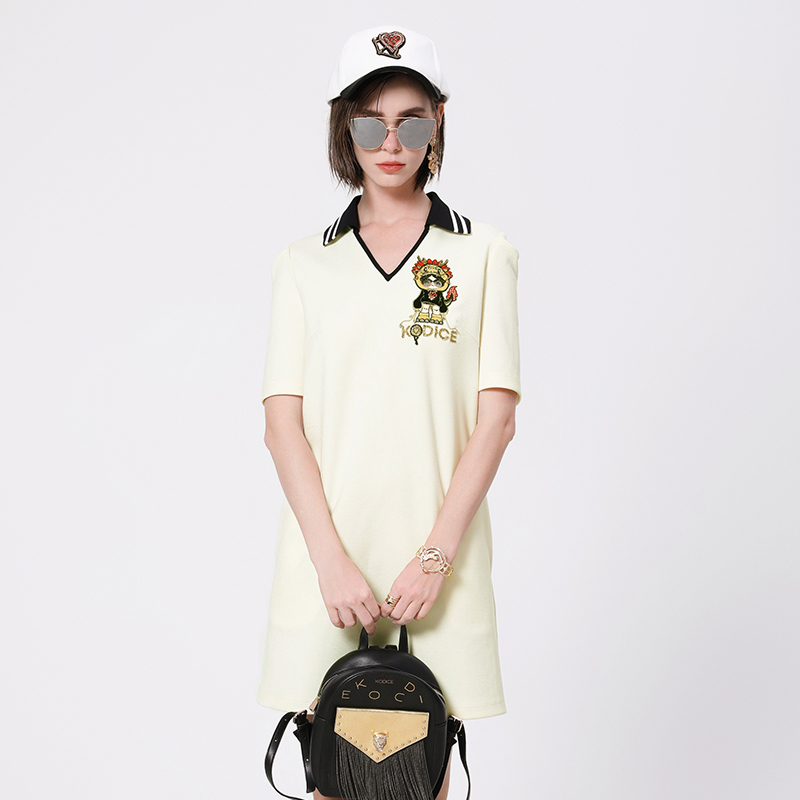 流行女装 时尚 白色连衣裙子撞色polo领贴布绣短袖 kodice春夏新款