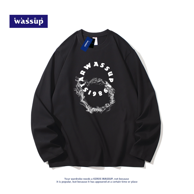 日系衣服圆领烟圈印花体恤 秋冬重磅t恤黑色上衣长袖 男士 打底衫
