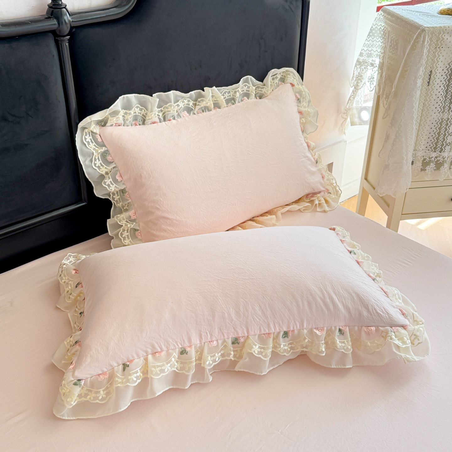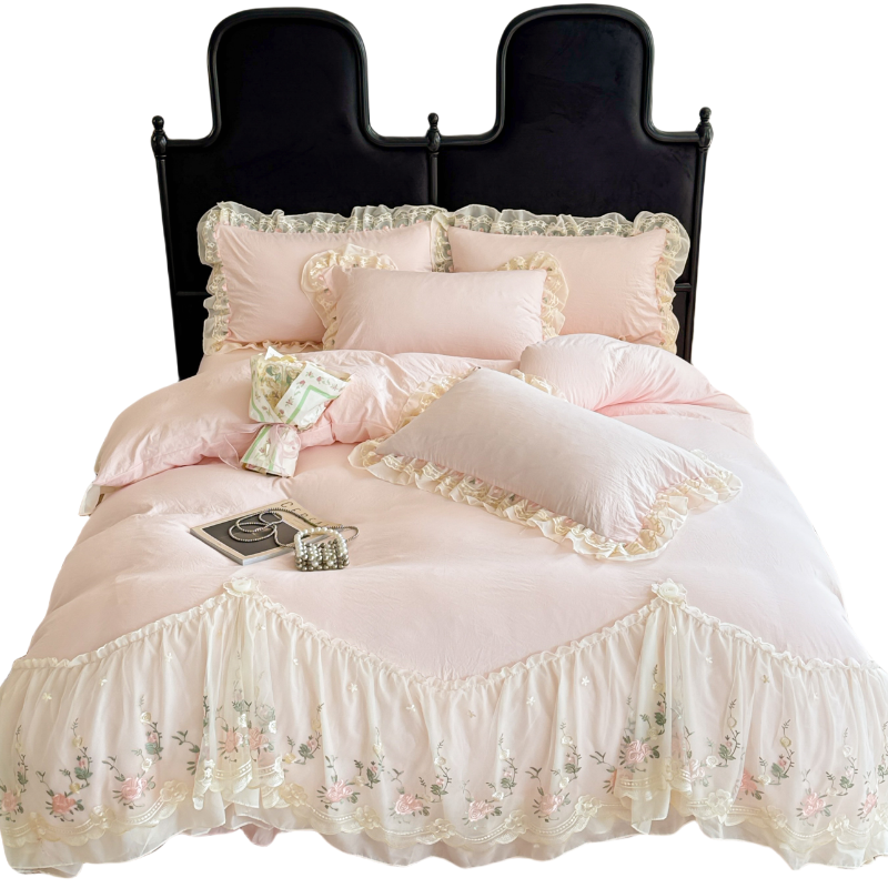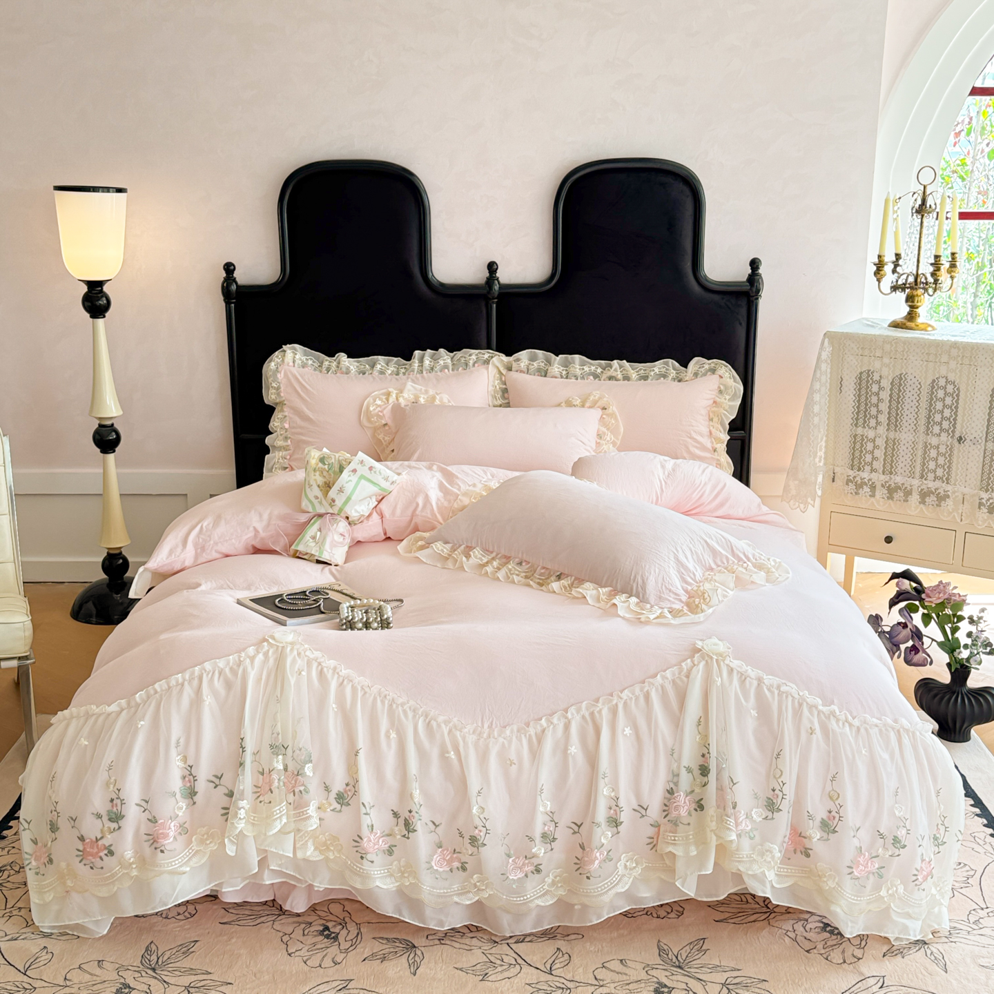新款 花边被套三件套软糯 云朵棉雪纺蕾丝刺绣床裙四件套公主风韩版
