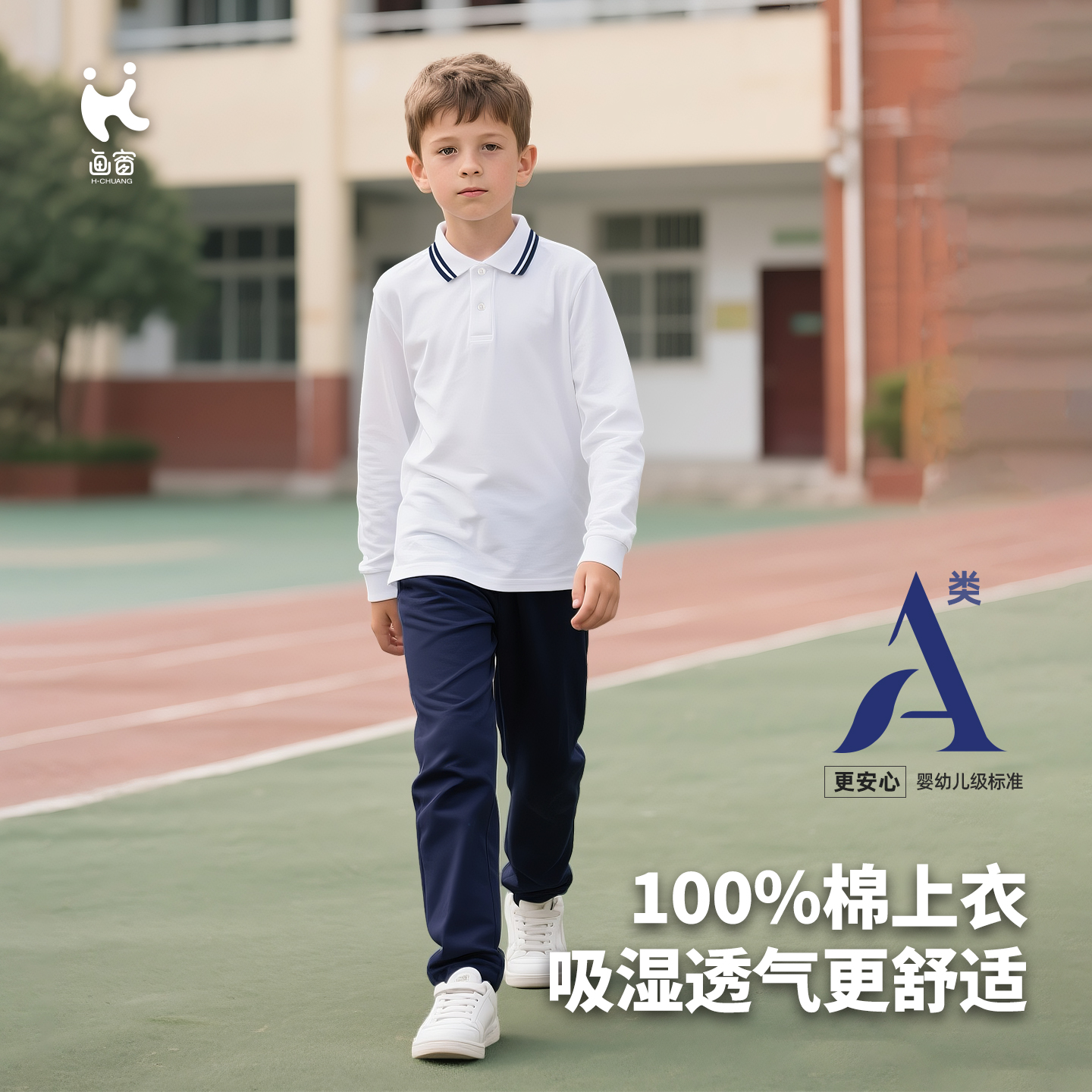 子女童春秋T恤翻领上衣打底衫 儿童校服套装 男童裤 polo衫 白色长袖