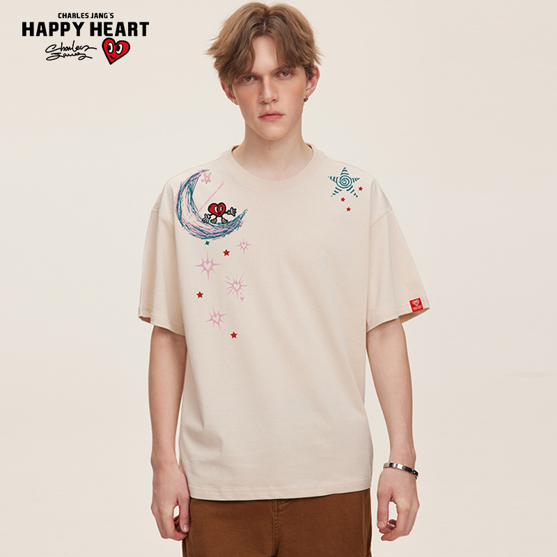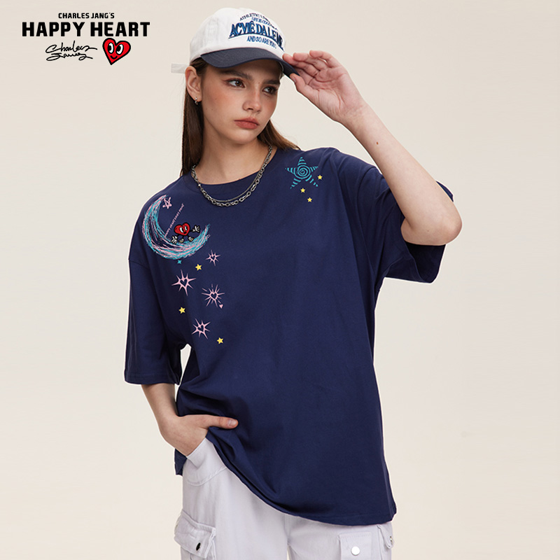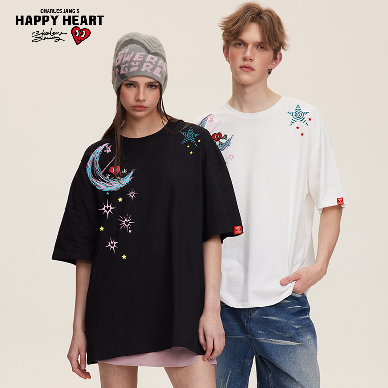 t恤男女同款 查尔斯桃心 短袖 纯棉休闲情侣潮夏季 月亮星星印花美式
