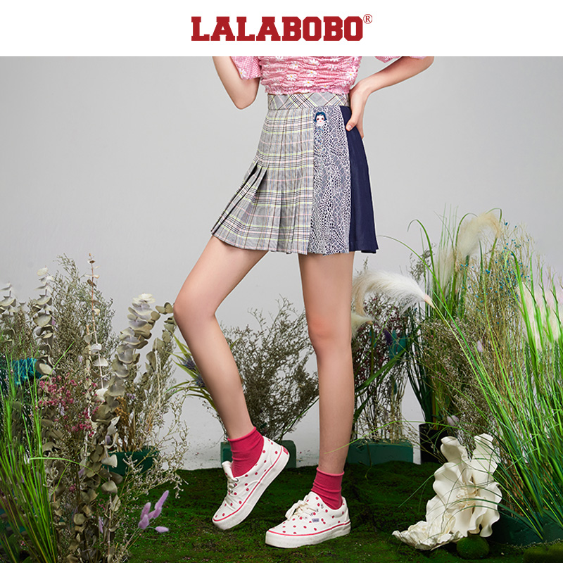 WXZQ13 L21A LALABOBO2024春新品 学院高腰拼接牛仔百褶A字裙裤