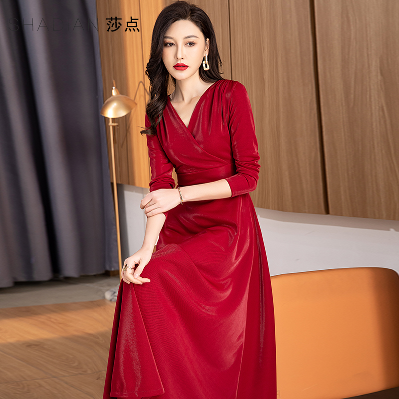 喜婆婆婚宴装 2025春秋新款 红色长裙收腰过膝长款 连衣裙秋季 长袖