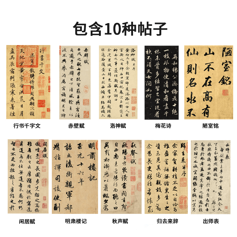 共10帖赵孟頫行书合集千字文洛神赋前后赤壁赋闲居赋秋声赋梅花诗明肃楼记出师表陋室铭归去来辞赵孟俯赵体行书毛笔书法临摹练字帖