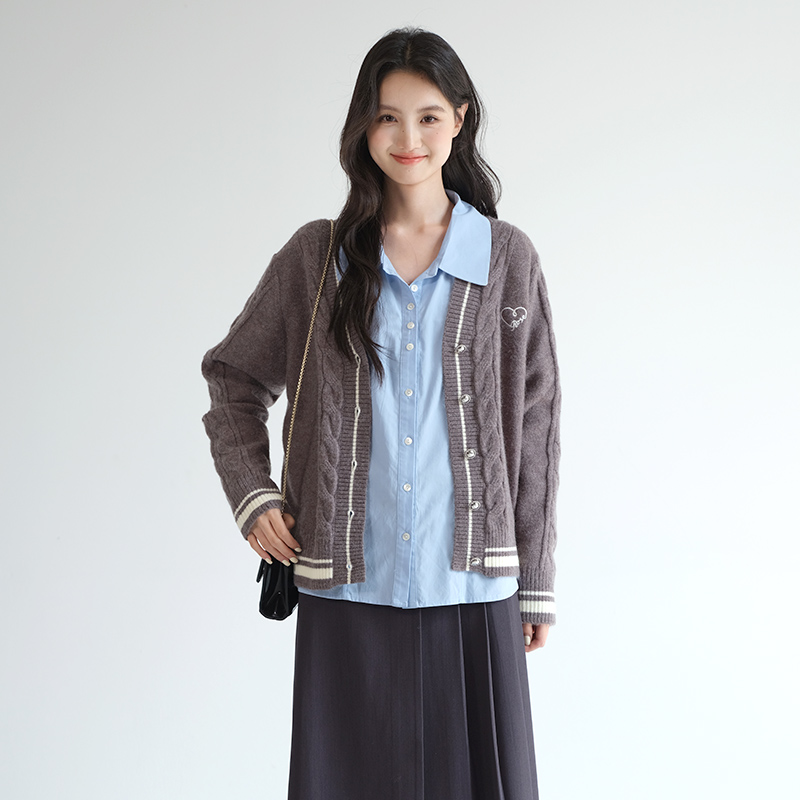 胖MM2025秋新款 麻花v领针织衫 学院风刺绣毛衣外套 女装 蓝若水大码