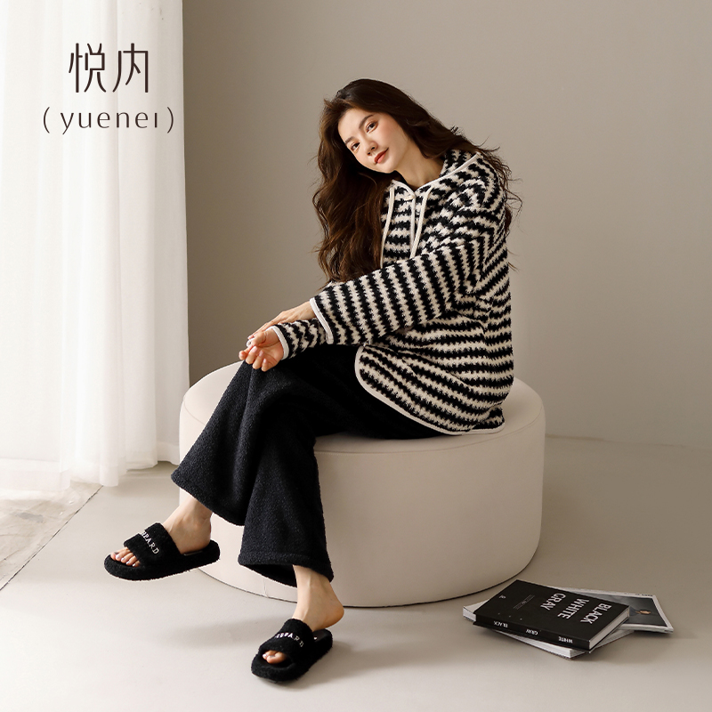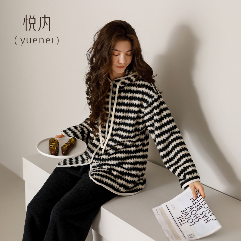珊瑚绒加厚加绒家居服连帽条纹套装 悦内半边绒睡衣女士秋冬款 冬季