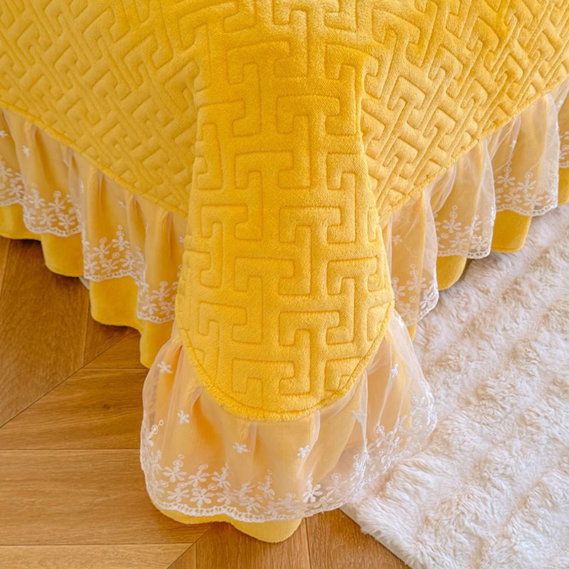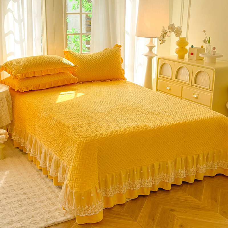 秋冬纯色牛奶绒夹棉绗缝床盖单件加厚蕾丝荷叶花边床单三件套保暖