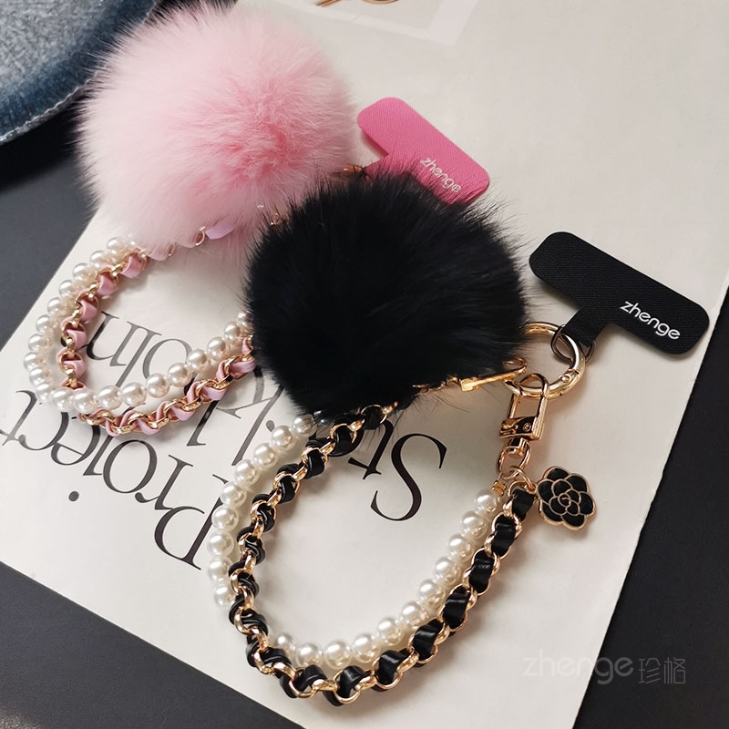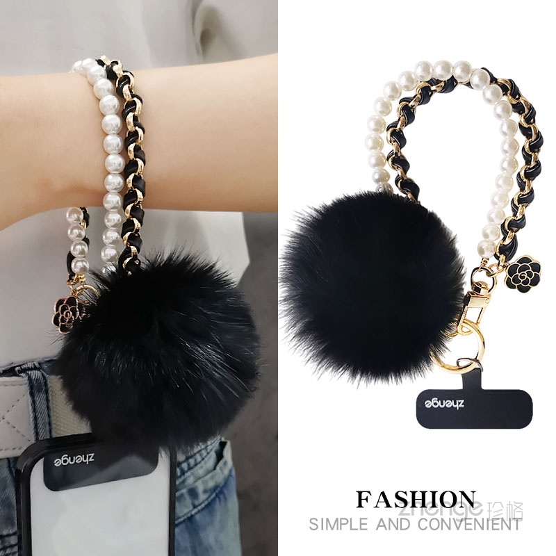 双域新小香风珍珠皮卡链手机挂绳轻奢时尚 手腕挂饰户外旅游逛街防丢手机壳手提包挂手链 高端机壳挂件毛球短款
