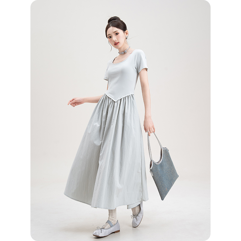 菲梦伊钉珠蓝色连衣裙女夏季 减龄超仙收腰度假百褶长裙子 飘逸时尚